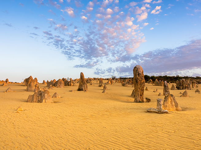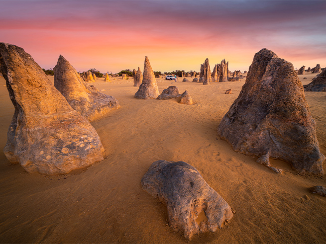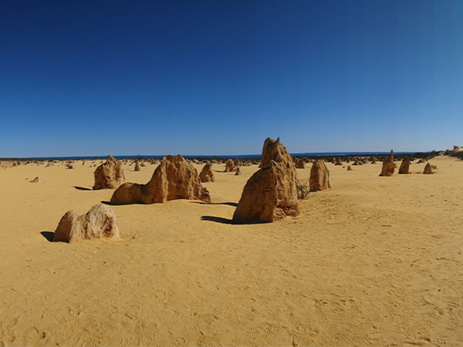 ピナクルズ到着 / ピナクルズ散策 荒野の墓標という異名をもつピナクルズ。背の高いものは4mにも及ぶ大きな岩。数千個も並ぶ姿は圧巻です。この無数の奇岩石がどのようにできたのか、ガイドがじっくり解説します。異空間に迷い込んだような感覚をお楽しみください。 |