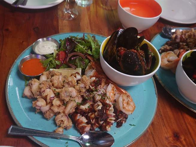 2軒目は近くにあるレストランで、シーフードの盛り合わせとワインを。