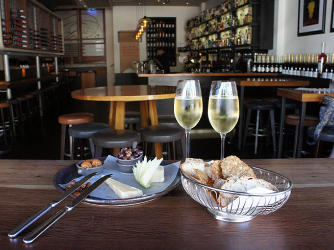1軒目はワインバーでワインとチーズ、パンなどのおつまみを。