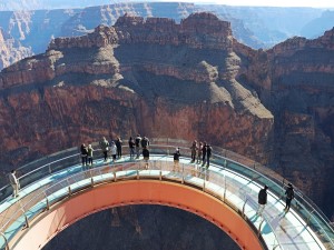 ●絶壁から空中に突き出るように作られたガラスの橋、スカイウォークを体験!足元からグランドキャニオンの谷底がハッキリと見えて、まさにその名のとおり空を歩いているような感覚でスリル満点!
