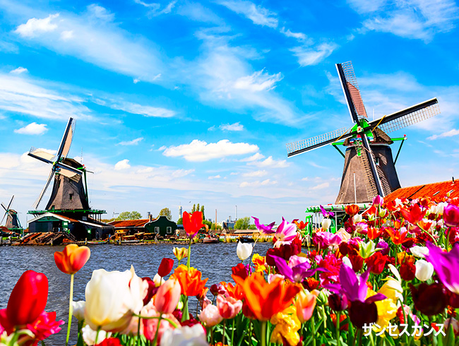 オランダ北部に位置する伝統的な風車と美しい木造建築が見られる観光地で、オランダの田舎の風景を体感できる場所として人気があります。