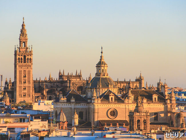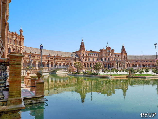 8世紀より数百年にわたりイスラム勢力の影響下にあったセビリアでは世界最大のゴシック様式のカテドラル(ヒラルダの塔含む)(入場)、スペイン広場、グアダルキビル川の河畔、黄金の塔、サンタクルス地区(いずれも下車)を訪れます。