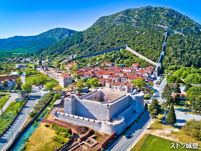 塩田から採れる塩で発展した歴史を持つストンで山肌に建設された城壁(下車)をご覧いただきます