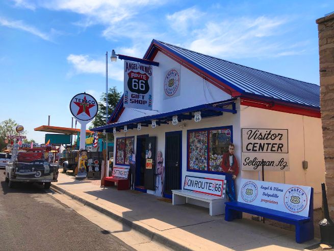 グランドキャニオン国立公園出発 ルート66の宿場町セリグマンで休憩・写真撮影 (約20分) ※ルート66を復活へと導いたエンジェルさんのギフトショップにご案内!(休業の場合は他のお店となります) 〜ディズニー/ピクサー映画「CARS」のモデルとなった町。「ルート66」はアメリカの北はシカゴから南はロサンゼルスまで続く約90年以上も続く歴史的な道路です~ ※昼食は車中にてサンドイッチ等と飲料水を配布 ※車中で新春ビンゴゲーム大会 (景品あり、ハズレなし) 途中でトイレで休憩 |