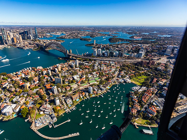 空から見下ろすシドニー湾は、青く輝く海と入り組んだ海岸線、点在するヨットやフェリーが織りなすダイナミックな景色が魅力。