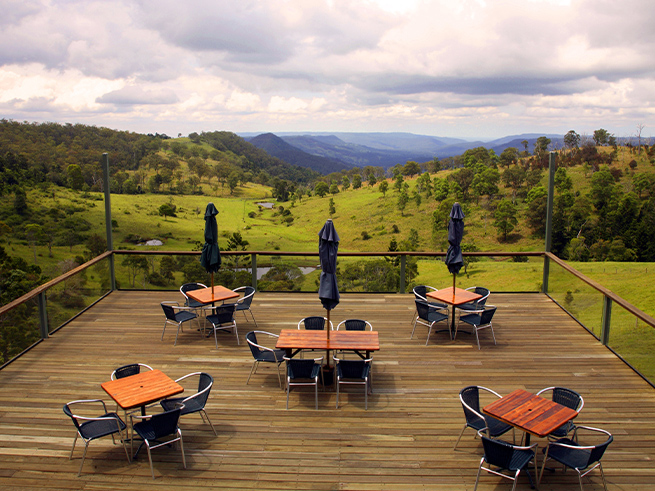 カマラン展望台到着 全長3500kmにおよぶ世界で6番目に長い山脈を望む270度の絶景パノラマビューを見ながらモーニングティーをお楽しみいただけます。 ゴールドコースト世界自然遺産レクチャーもここで聞けます。 |