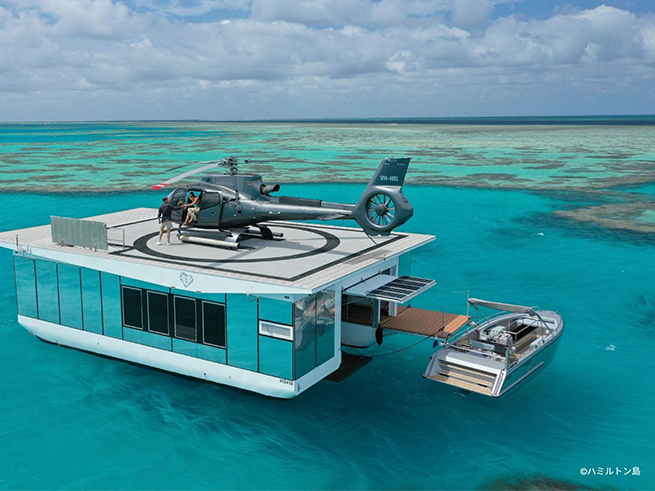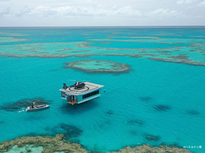 ■ ミラーの外装、豪華な内装、そして息をのむグレートバリアリーフの絶景を眺めながら、海に浮かぶハートアイランド・ポンツーンで素敵にリラックス。