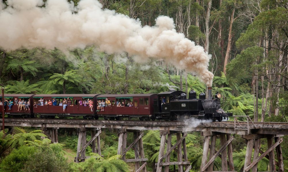 メルボルン郊外の美しいダンデノン丘陵を走る人気観光列車「パッフィンビリー鉄道」に乗って、のどかな森の風景を満喫🚂