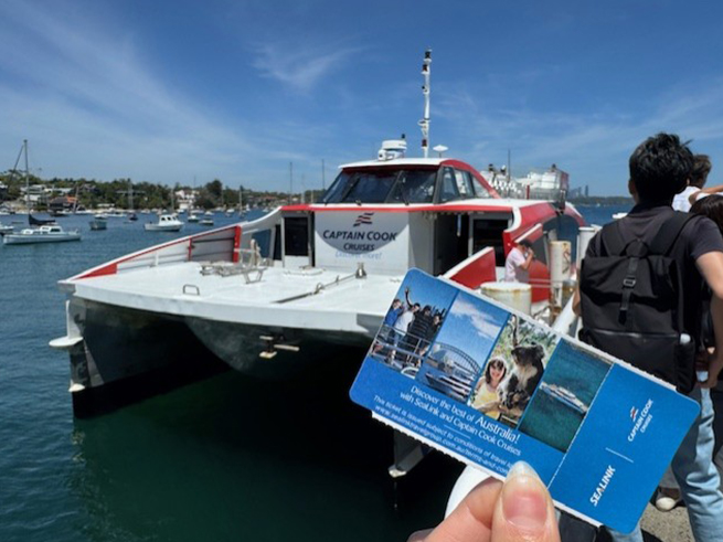 フェリー乗船 マンリービーチへ向かうフェリーに乗船します。所要時間は約15分です🚢 |