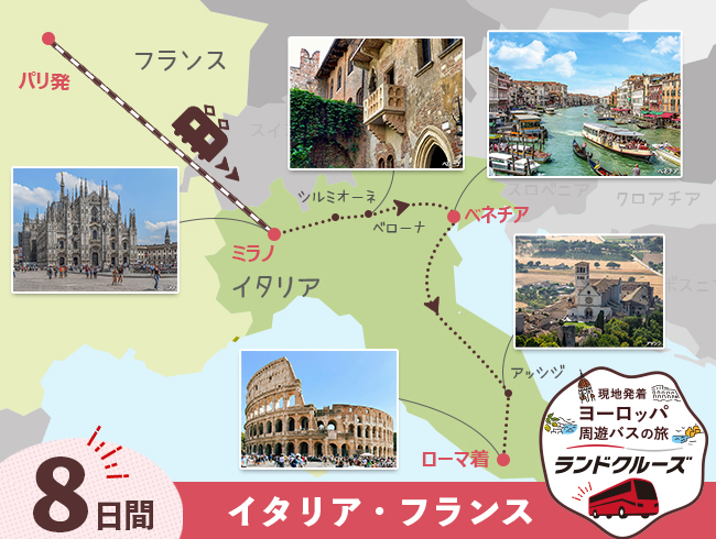 検索結果一覧 閉じる 人気ワード 天使の海 イタリア 九ふん 韓国 グアム(グァム) ハワイ パリ ダイヤモンドヘッド 日本語ガイド パールハーバー シンガポール ロンドン 検索条件を指定する 参加日 参加したい期間でツアーを絞り込むことができます。※空席状況はツアー詳細にてご確認ください 参加日未定 出発地 エリアを選択 アジア アメリカ・カナダ・中南米 ハワイ グアム・サイパン・パラオ ヨーロッパ オセアニア 中国 国・地域を選択 都市を選択 カテゴリー 日数 ツアーの日数で絞り込むことができます(日帰り~最長30日) 日帰り 30日 日帰り-30日 行きたい都市 88件 のツアーがあります。 おすすめ順 売れ筋 安い順 高い順 パリ発 パリとイタリア 8日間 (ID:2505630/2605630) ヨーロッパ周遊ランドクルーズ!パリ/エッフェル塔・凱旋門、ミラノ、ベネチア、ローマ/コロッセオなどを訪問。1名様から催行、充実した周遊の旅を... 8日間 パリ発 ローマ着 237,440円 ローマ発 ローマ・フィレンツェ・ミラノ、スイスとパリ 11日間(ID : 2506836/26068... ヨーロッパ周遊ランドクルーズ!ローマ/コロッセオ、フィレンツェ、ミラノ、チューリッヒ、ジュネーブ、フィルスト・クリフウォーク、パリ/エッフェ... 11日間 ローマ発 パリ着 428,740円 ロンドン発 ロンドンとベルギー、パリ、イタリア 10日間 (ID:2505635) 訪問はロンドン/タワーブリッジ/ビッグ・ベン、パリ/エッフェル塔/凱旋門、ブルージュ/マルクト広場、ミラノ/ドゥオモ、シルミオーネ、ベローナ... 10日間 ロンドン発 ローマ着 345,280円 パリ発 パリとルクセンブルク、ドイツ、オランダ、ベルギー 9日間 (ID:2505509/2605... 訪問はパリ/エッフェル塔/凱旋門、ランス、ルクセンブルク、ストラスブール、ハイデルベルク、ライン川、ケルン/ケルン大聖堂、デ・ハール城、アム... 9日間 パリ発着 225,600円 フランクフルト発 ドイツとオランダ、ベルギー、パリ 7日間 (ID:2505623/2605623... 訪問はパリ/エッフェル塔/凱旋門、ライン川、ケルン/ケルン大聖堂、アムステルダム、ブリュッセル/グランプラス、ブルージュ/マルクト広場。世界... 7日間 フランクフルト発 パリ着 163,680円 パリ発 パリとモンサンミッシェル ハイライト 5日間(ID : 2506855/2606855) ヨーロッパ周遊ランドクルーズ!パリ/エッフェル塔・凱旋門、ジベルニー、ルーアン、カーン、モンサンミッシェル、シャルトル大聖堂などを訪問。1名... 5日間 パリ発着 119,680円 フランクフルト発 ドイツとオランダ、ベルギー、パリ、フレンチバスク、バルセロナ 10日間 (ID:... 訪問はライン川、ケルン/ケルン大聖堂、アムステルダム、ブリュッセル/グランプラス、ブルージュ/マルクト広場、モンセラット、バルセロナ/サグラ... 10日間 フランクフルト発 バルセロナ着 261,600円 フランクフルト発 ドイツとオランダ、ベルギー、パリ、イタリア 11日間 (ID:2505502/2... 訪問はライン川、ケルン/ケルン大聖堂、アムステルダム、ブリュッセル/グランプラス、ブルージュ/マルクト広場、パリ/エッフェル塔/凱旋門、ミラ... 11日間 フランクフルト発 ローマ着 318,560円 パリ発 パリ、モンサンミッシェルとロワールの古城巡り、英国周遊 エディンバラまで13日間(ID ... ヨーロッパ周遊ランドクルーズ!パリ/エッフェル塔・凱旋門、カーン、モンサンミッシェル、レンヌ、アンボワーズ、シャンボール、ロンドン/タワーブ... 13日間 パリ発 エディンバラ着 472,260円 パリ発 パリ・ルクセンブルクからフランクフルト<初日空港送迎なし> 2日間(ID : 2506802... ヨーロッパ周遊ランドクルーズ!パリ/エッフェル塔・凱旋門、ルクセンブルク、ストラスブール/サンポール教会、フランクフルトなどを訪問。1名様か... 2日間 パリ発 フランクフルト着 45,600円 アムステルダム発 ベルギーとパリ 5日間 (ID:2505504/2605504) 訪問はパリ/エッフェル塔/凱旋門、ブリュッセル/グランプラス、ブルージュ/マルクト広場。現地発着ランドクルーズ。1名催行、日本語係員同行。 5日間 アムステルダム発 パリ着 99,040円 パリ発 モンサンミッシェル ハイライト、スイス周遊とイタリア14日間(ID : 2606865) ヨーロッパ周遊ランドクルーズ!パリ/エッフェル塔・凱旋門、カーン、モンサンミッシェル、チューリッヒ、ジュネーブ、マルティニ、ツェルマット、マ... 14日間 パリ発 ローマ着 550,460円 もっと見る