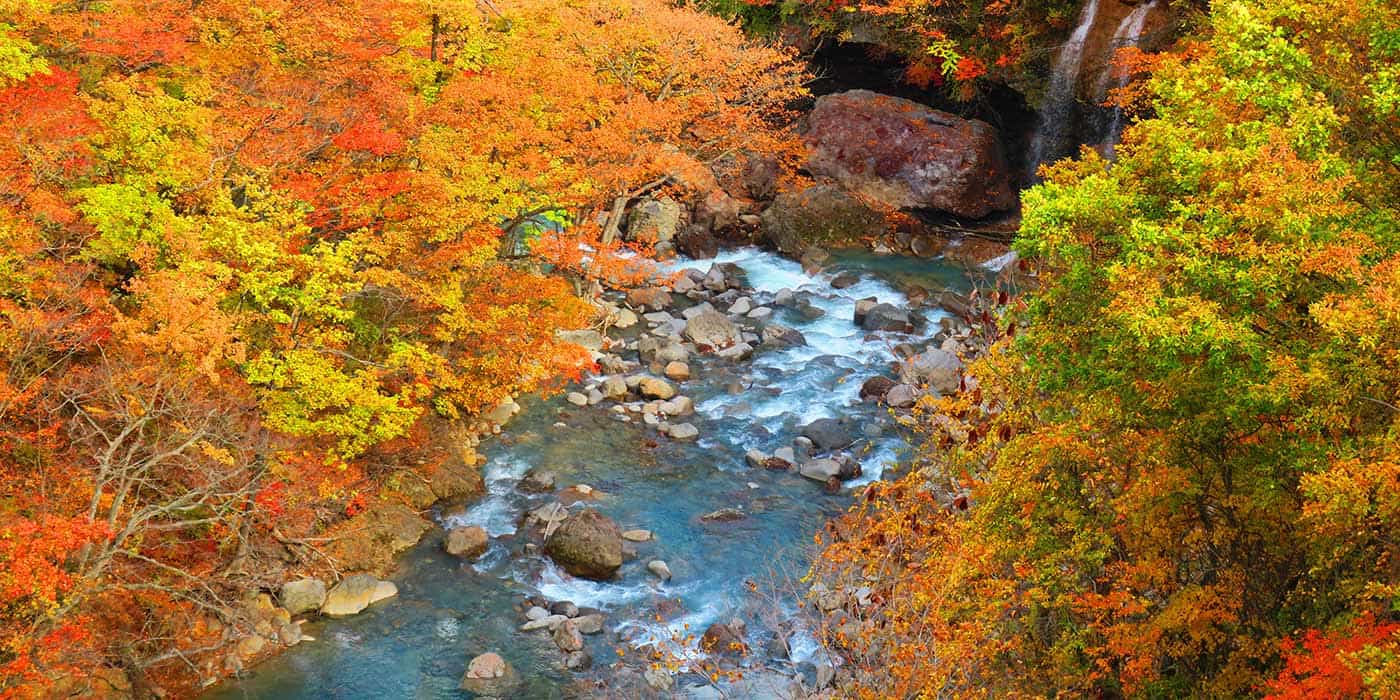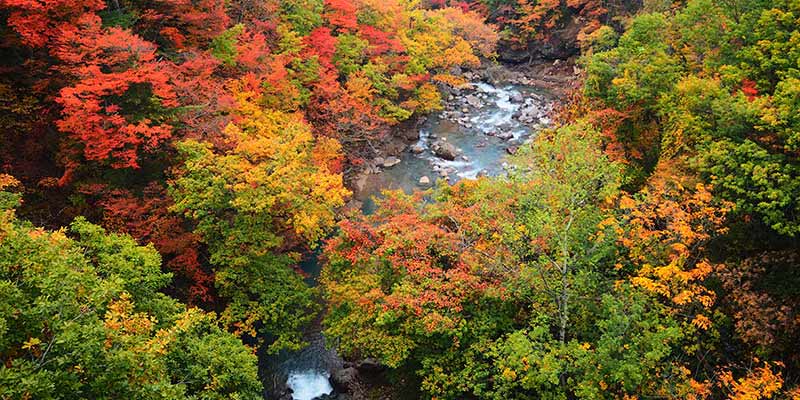 岩手県と秋田県の県境にほど近い松川渓谷は、大自然にあふれた渓谷美を満喫できる、岩手県屈指の紅葉スポットです。ブナやカエデが華やかに色づく10月中旬から10月下旬にかけてが、紅葉のベストシーズン。切り立った灰色の岩壁の裾には青々とした清流が流れ、見上げればこんもりと茂る森が赤や黄色に染まり、ところどころに混じる常緑樹の緑がよりいっそう紅葉の赤みを引き立てます。とりわけ、一番美しい景観を見ることができるのが、松川渓谷に架かる「森の大橋」の周辺です。目がくらむような高さにある橋の上から眼下の渓谷を見下ろせば、上流側・下流側ともに、飛沫を上げて滔々と流れる豊かな水と渓谷に迫り出した紅葉の美しいコントラストが一望できます。