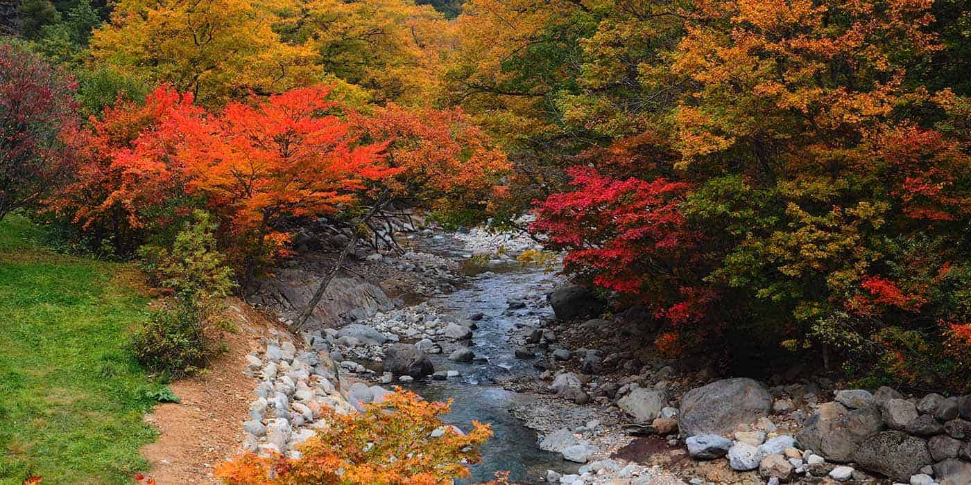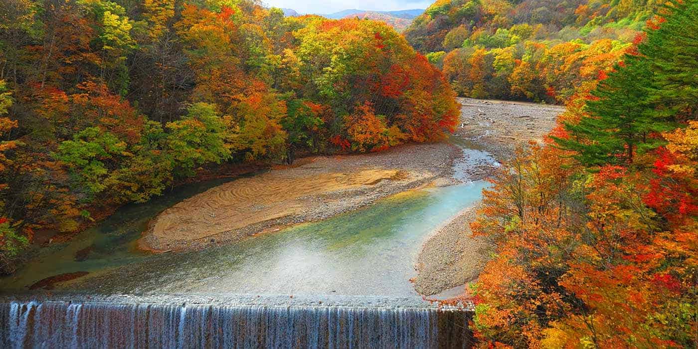 松川渓谷を彩る、一面の錦秋。深々と切れ込んだ谷底を流れる清流は、水しぶきを散らしつつ、迫り出した紅葉の隙間を縫うように見え隠れして流れていきます。周囲の山々もまた負けじと赤や黄色に燃え上がり、「森の大橋」周辺を華やかに飾り立てます。
