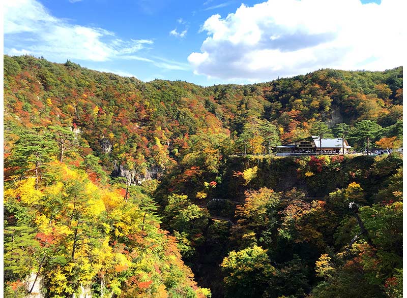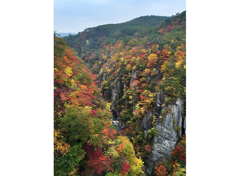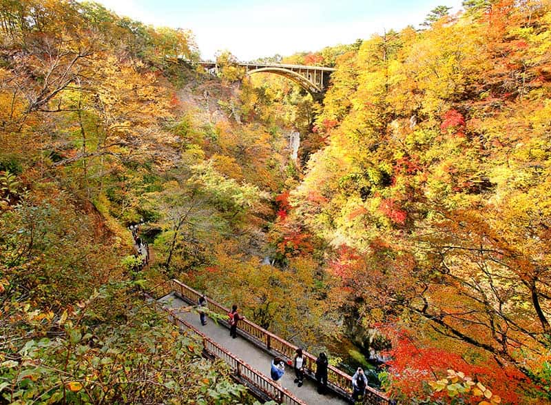紅葉の名所を数多く抱える東北地方の中でも、毎年ベスト3に入るほどの高い人気を誇るのが、宮城県にある「鳴子峡」です。江戸時代から交通の要所として栄えた宿場町・旧鳴子町に位置し、およそ2.5kmに渡ってV字型峡谷が広がります。高さ約100mの断崖が連なる絶景地は、紅葉シーズンを迎えると一面の錦に染まり、ところどころに覗く松の緑や奇岩の灰色がいっそう紅葉の鮮やかさを引き立ててくれます。その美しさは、まさに東北トップクラス。周辺には大深沢遊歩道(2.2km)が整備されており紅葉を満喫できることや、谷底への階段の遊歩道を下ると大深沢橋と紅葉の景色を見上げられることなど、紅葉狩りを楽しむ幅が広いことも人気の一つです。