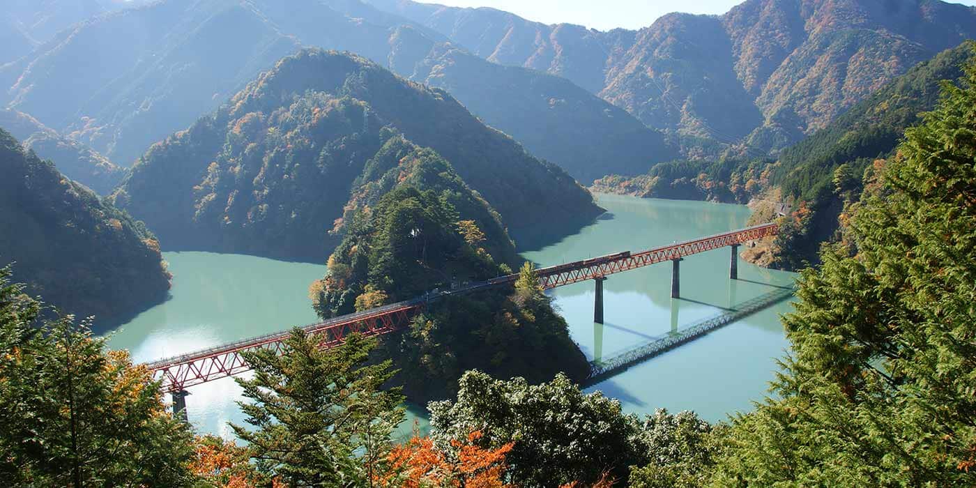 湖を渡る真っ赤な橋の真ん中に、ぽつんと浮かぶ小さな駅。小さいながらに抜群の存在感を放つこの駅が、大井川鐡道井川線の「奥大井湖上駅」です。大井川本川上流部に建造された長島ダムのダム湖である接岨湖の上に、たった一つ、存在しているこの駅は、本当に湖に浮かんでいるわけではなく、実際は湖に張り出した小さな半島の先端に存在しています。かつてダムが建造される前は湖底に当たる位置に駅があったのですが、路線が沈んでしまうため、代わりに、現在の位置に設置されるようになりました。1日わずか5本しか運行していない列車に乗って橋を渡れば、まるで本当に湖の上を駆け抜けているかのような気分を味わえます。