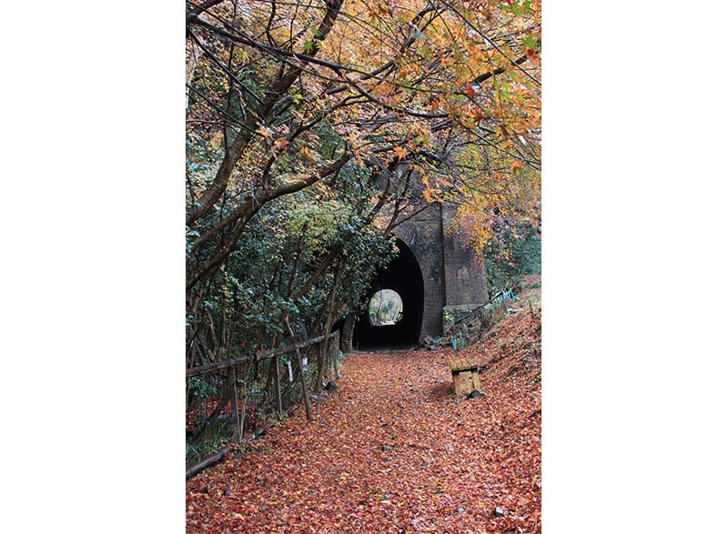 紅葉の時期には忘れ去られた路線に自生した200本もの紅葉が赤々と染まり、古びたトンネルの出入り口を飾ります。トンネルの中を通り抜けると、トンネルの出口で梢を広げる紅葉の赤が鮮烈に目に焼き付き、まるで丸窓を覗きこんでいるかのような気分を味わえます。また、約43年間人の手が入らなかったこともあり、「愛岐トンネル群」には絶滅危惧種の草木も発見されています。ご覧いただけるのは特別公開の時だけです。