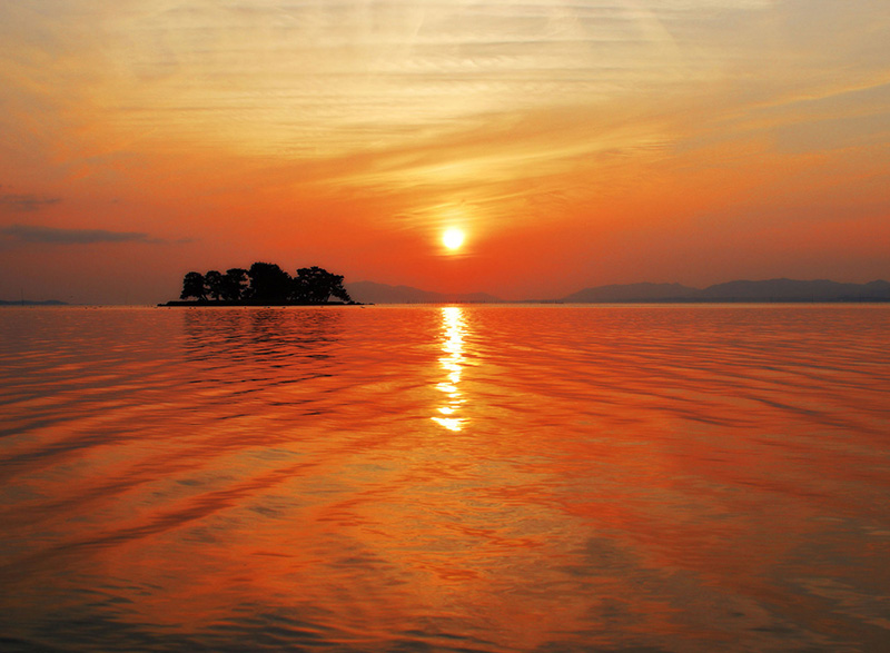 島根県の県庁所在地である松江市と、神々の息吹が残る地・出雲市との両方にまたがっている宍道湖は、日本で七番目の広さを誇る湖です。この宍道湖は「日本の夕日百選」に選ばれるほどの夕日の名所であり、「水の都・松江」の象徴でもあります。夕日が落ちるのは出雲大社がある方角であることから、落ちていく夕日が空を、湖面を、一面の黄金に染め変えてゆくさまは、神々しさに満ちあふれています。とりわけ、夕日が落ちる間際。湖に一つだけ浮かんだ嫁ヶ島のシルエットがぽつんと浮かび上がる様子は、何とも神秘的な雰囲気を漂わせます。近隣には戦国時代・出雲地方の経済の中心となっていた松江城があり、水辺に沿う街の美しい風景を併せて楽しめます。