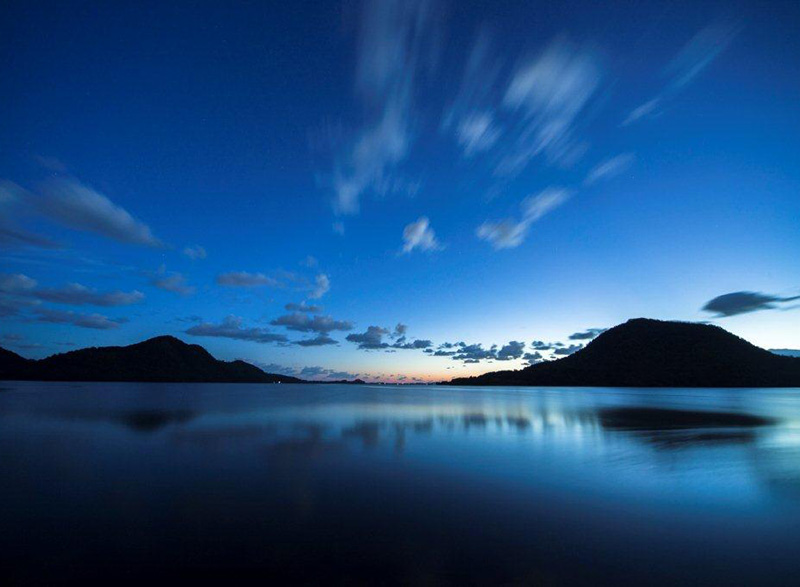 夜明け前の久美浜湾で見ることができる絶景は、早朝、わずかな時間しか見ることができません。太陽が水平線から顔を出す直前、にじみ出した朝の光が紺碧の夜空を明るい青に変化させると、空を映した湖面も同じ色に変化し、視界いっぱいに幻想的な青の世界が広がります。太陽が昇りはじめると青い世界はみるみる色づき、白砂青松の絶景を取り戻していきます。世界が夜から朝に変わる瞬間。世界が青く染まるひと時も、どうぞお見逃しなく。