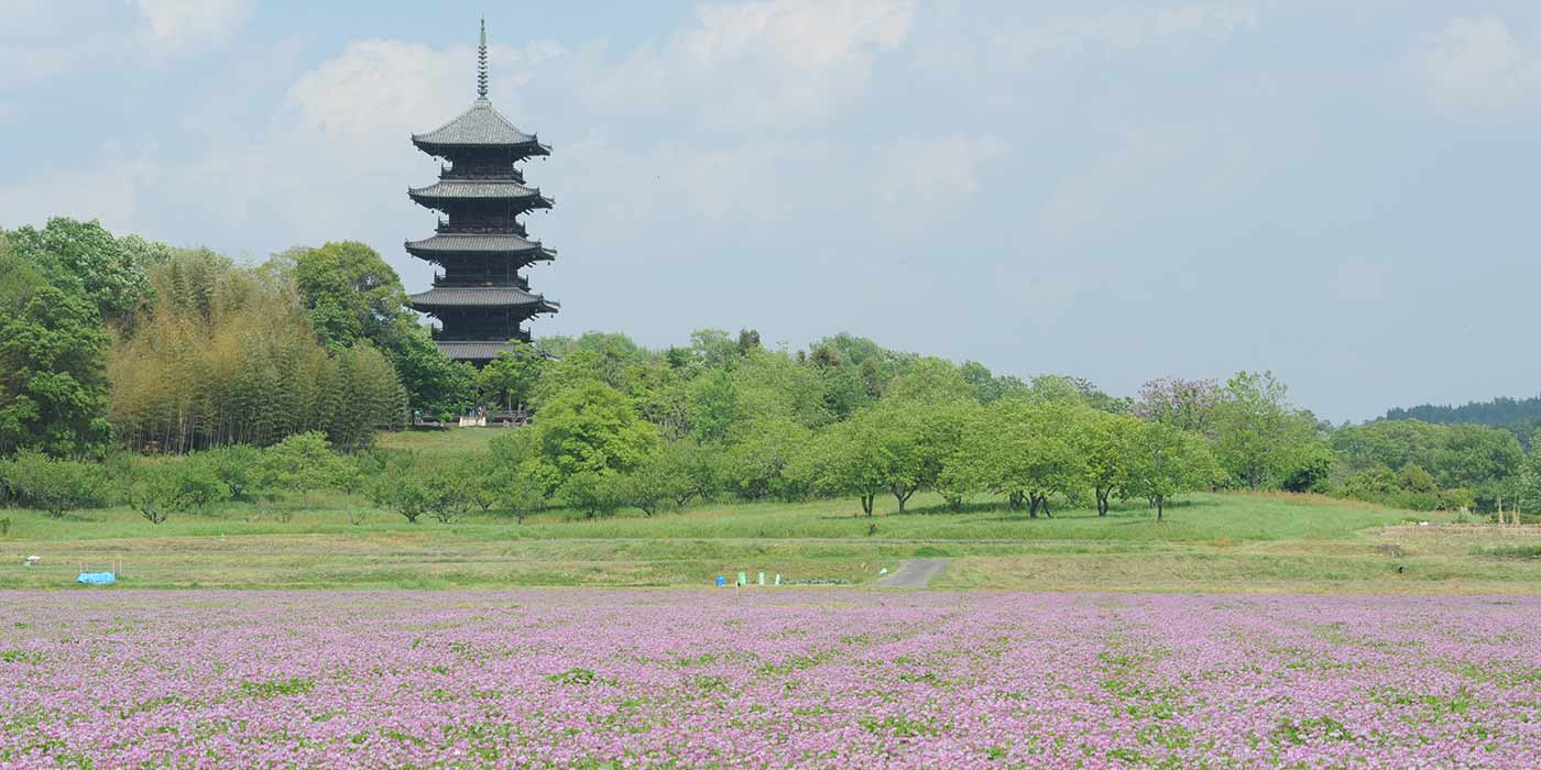 吉備路のシンボルである五重塔を背景に美しいれんげの花が咲き乱れる田園風景は、春にしか見ることができません。おすすめは、サイクリングをしながら吉備平野をめぐるコース。春の風を浴びながら、ピンク色の花畑を駆け巡れば、五重塔まであっという間にたどりつけます。