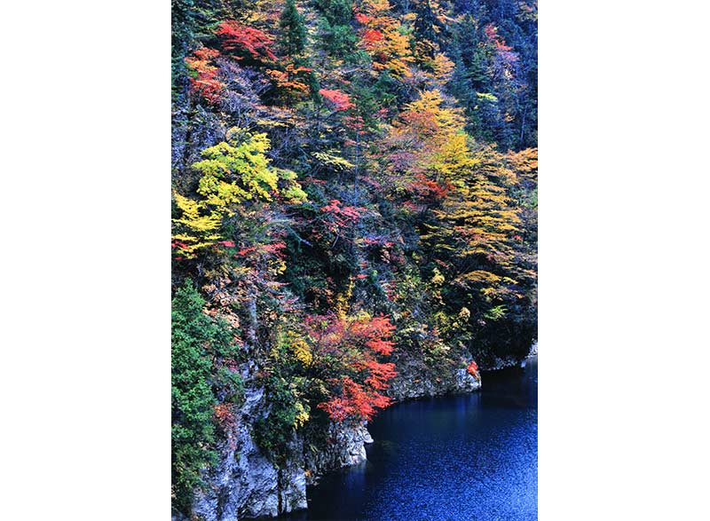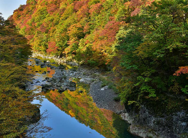 急峻な岩壁から流れ落ちる名瀑に、一度見たら忘れられない奇妙な形をした巨大な岩の数々、それらを包み込む豊かな大森林。そして、渓流に架けられた長大な吊り橋・神の岩橋。抱返り渓谷は歩きながらどこを眺めても絵になるような絶景スポットばかり。日差しに白く照る岩肌と紅葉の美しいコントラストが青空に映え、渓谷を散策する人々を楽しませてくれます。