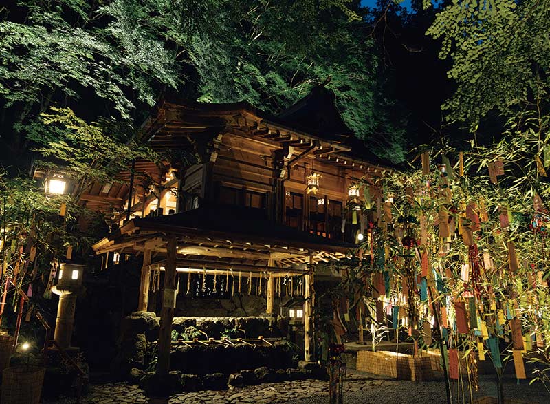 夏の京都を彩る「青もみじ」。貴船神社でも青々とした梢を広げる木々を、参道や境内のあちらこちらで見ることができます。さらに七夕の時期になると、境内に色とりどりの短冊を吊るした笹が飾られ、普段とは異なるにぎやかな雰囲気を漂わせます。昼間に訪れても美しい光景ですが、この時期に貴船を訪れるなら、夜が特におすすめです。夕暮れ時から20時頃まで、参道や境内が一斉にライトアップされ、青もみじや社殿、七夕飾りがやわらかな光に照らされます。もともと七夕は日頃の穢れを祓い、技芸上達を願う行事だけでなく、豊作を願う雨乞いの儀式という側面も持っていました。水神を祀る貴船神社は、願いごとをするのにぴったりの場所といえます。