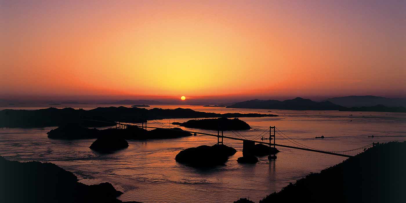 山道を走り、カーブを抜けた瞬間、目の前に広がる大パノラマ。周囲を遮るものがない展望台からは、空と海を渡る風を全身で浴びながら、夕暮れ時に浮かぶ大小さまざまな島影と美しい橋のシルエットが楽しめます。