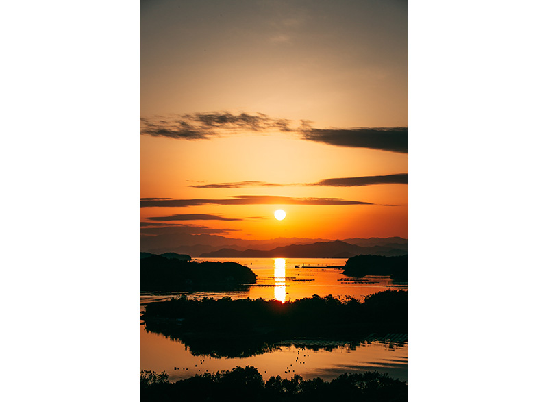 複雑に入り組んだ海岸線に囲まれ、大小さまざまな島が無数に浮かぶ英虞湾は、三重県屈指の絶景スポット。青空を映した海に浮かぶ島々がはるか遠くまで連なる様子もすばらしい景色ですが、ひときわ人気が高いのが夕暮れ時。それも春と秋にそれぞれ一ヶ月だけ見ることのできる、特別な夕日があります。それは、桐垣展望台から見る夕日です。空と海をまばゆいほどのオレンジ色で輝かせながら、夕日が間崎島に落ちてゆくのです。間崎島は展望台から真ん中に見えるため、写真の構図も決めやすく、美しい瞬間を狙いやすいのも魅力の一つ。夕日に照らされてきらきらと光る水面に浮かぶ養殖筏や島々のシルエットが黒く浮かび、燃え上がるオレンジ色と鮮やかなコントラストを見せてくれます。