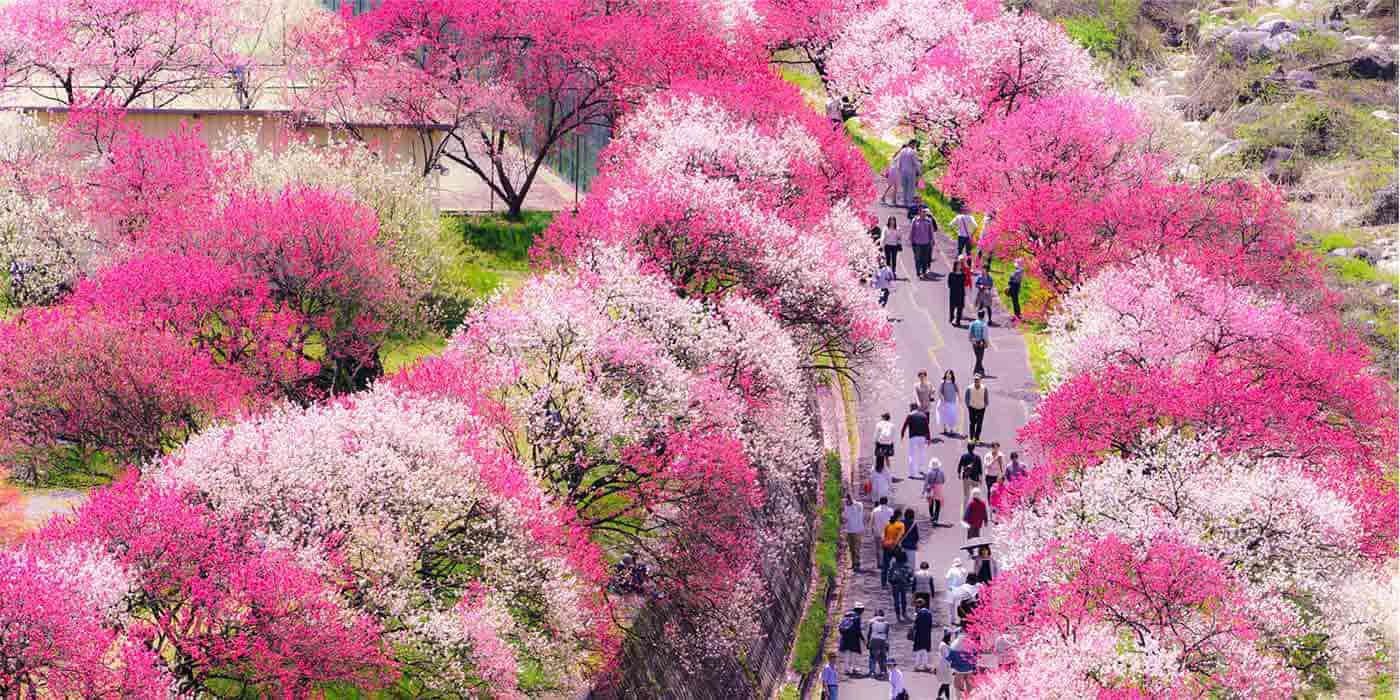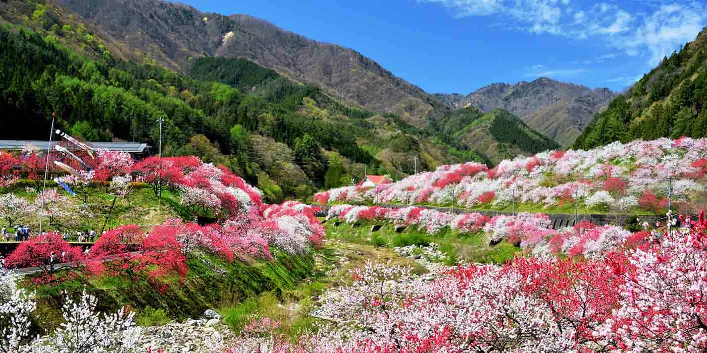 「日本一の星空の村」と謳われる、長野県阿智村。この地で春になると、赤、ピンク、白と、3色の花が村全体を彩ります。村全体が華やぐ様子は、まさに桃源郷と呼ぶのにふさわしい絶景です。この花の正体は、「三色花桃」と呼ばれる観賞用の桃。月川温泉郷、昼神温泉郷では、散策しながらこの花桃を楽しめます。また、国道256線沿いの約40kmに渡って花桃の木が植えられたドライブコース「はなもも街道」もオススメです。この花桃の魅力のひとつが、花を見られる時期の長さ。阿智村のあちこちに植えられていますが、植えられた場所の標高によって見頃が少しずつずれるので、4月上旬から4月下旬にかけて、花桃が咲き誇る景色を見ることができます。