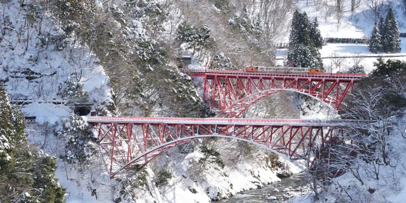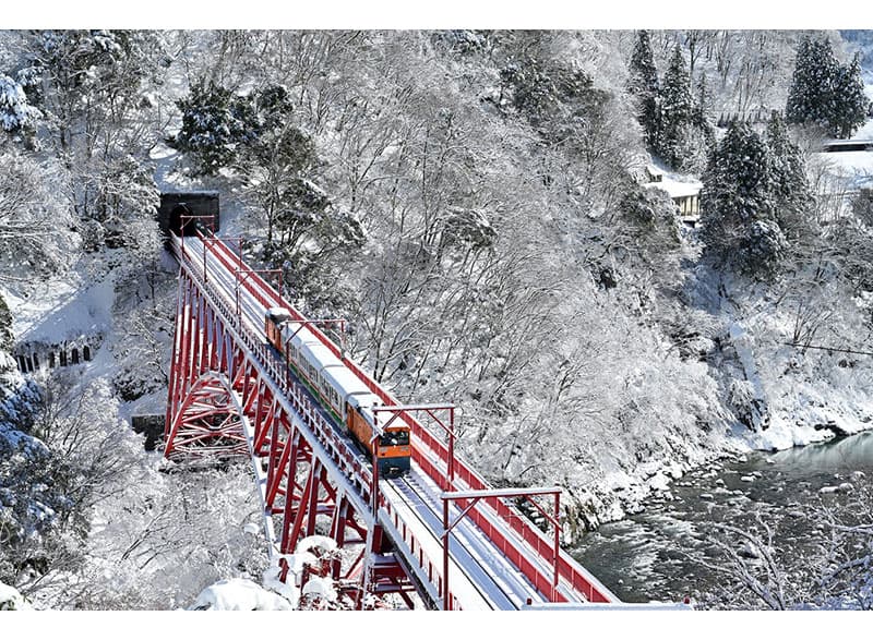 真冬の黒部峡谷は雪に覆われ、まるで水墨画のような雰囲気に一変します。雪景色の中で目を引くのは、峡谷に架かる二つの赤い鉄橋です。並んで架かる橋は「旧山彦橋」、「新山彦橋」と呼ばれ、トロッコ電車は新山彦橋を通って峡谷を渡ります。プレミアムツアーでは窓付きのリラックス客車で、宇奈月駅から新山彦橋まで530mの区間を乗車できます。さらに機関車や客車を点検・整備している機関車検修庫や黒部川電気記念館を解説付きで見学できます。冬限定の雪と峡谷が織り成す絶景をぜひご覧ください。