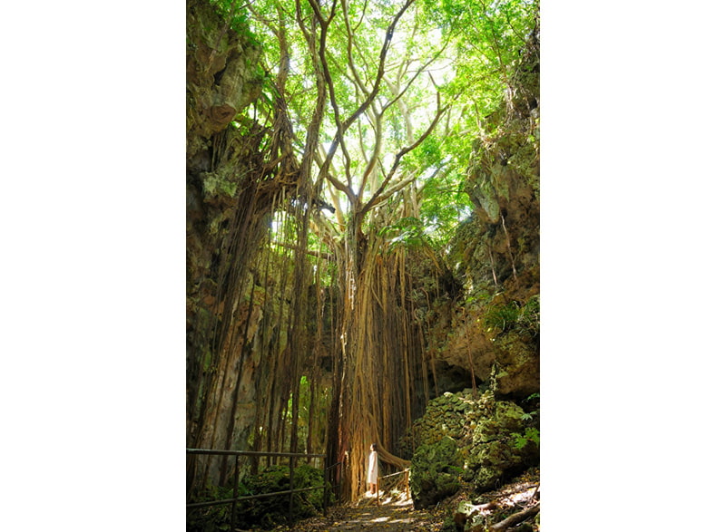 生命力に満ちた巨木と、何万年もの時を経た巨岩が織りなす神秘の地。「ガンガラーの谷」は数十万年前の鍾乳洞が崩壊してできた谷間に広がる森にあり、沖縄の自然と人の結びつきを全身で体感できる場所です。古いガジュマルの木々は多くの生命をはぐくむ森であり、神秘的な鍾乳洞で形成された洞窟は、古くから人々が安産や良縁を祈願して祈りに訪れる地でもありました。晴れた日に木漏れ日が差し込むガンガラーの谷も絶景ですが、雨の日にはしっとりと濡れた谷間と洞窟が神秘的な雰囲気を醸し出し、森と大地の息吹をより身近に感じることができるかもしれません。