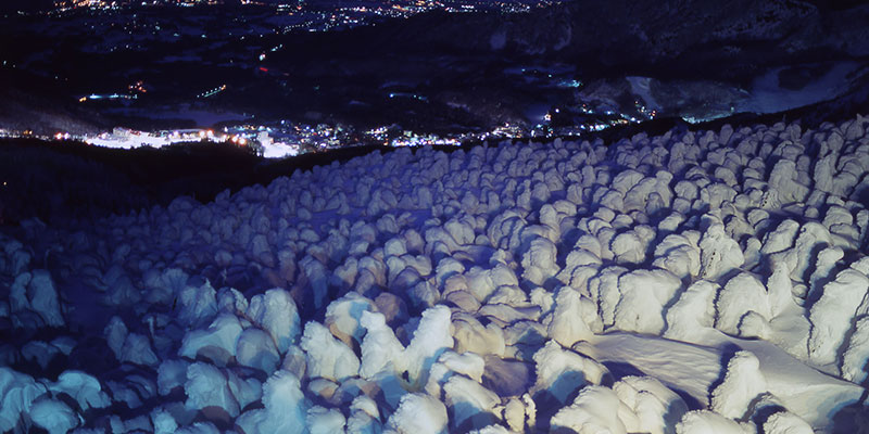 「冬の蔵王」を象徴する、ぽってりとした白い雪の塊が幾百も並んだ奇妙な景色。まるで雪でこしらえたおばけのような白い塊が、雪面に数えきれないほど集まった不思議な光景の正体は、蔵王連峰の特別な気象条件と自然環境で生み出された「樹氷」です。夏には青々とした緑の山が、冬になると一変し、真っ白なおばけが一斉に姿を見せる様子は、一目見たら忘れられません。蔵王の代名詞でもあるこの自然の芸術品は「スノーモンスター」とも呼ばれており、毎年多くの観光客がスノーモンスターをめあてに蔵王を訪れます。冬のシーズン中は夜になると鮮やかなカクテル光線でライトアップされるため、青い闇に幻想的に浮かび上がるスノーモンスターの不思議な世界を満喫できます。鑑賞スポットである蔵王ロープウェイの地蔵山頂駅までは、麓からおよそ20分ほど。標高1,661mから見下ろす夜景と共に、冬の蔵王ならではの魅力を楽しめます。