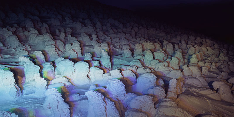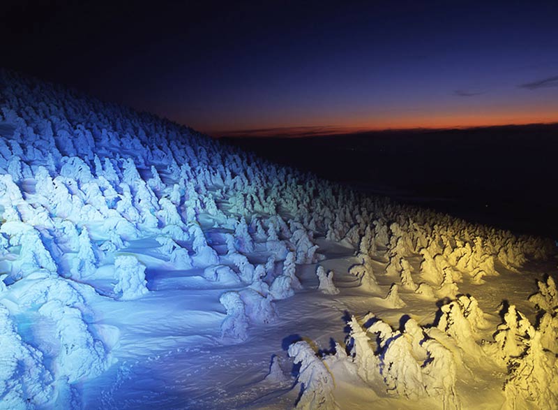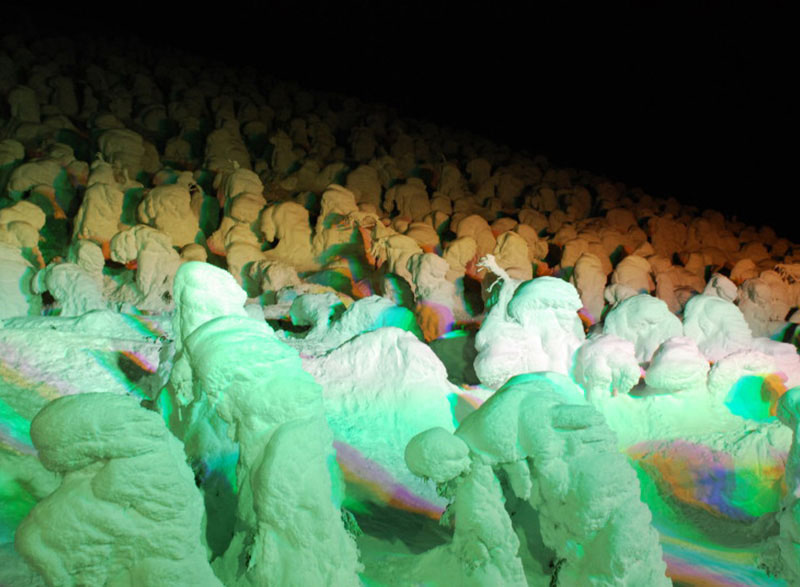 一目見たら忘れられない、真っ白な雪のおばけの群れ。広々とした青空の爽快さと純白の樹氷のコントラストが目を惹く昼の情景とは正反対に、暗闇の中、鮮やかなカクテル光線で浮かび上がるスノーモンスター達の夜の姿は、訪れた人々を奇妙で不思議な世界へと誘います。
