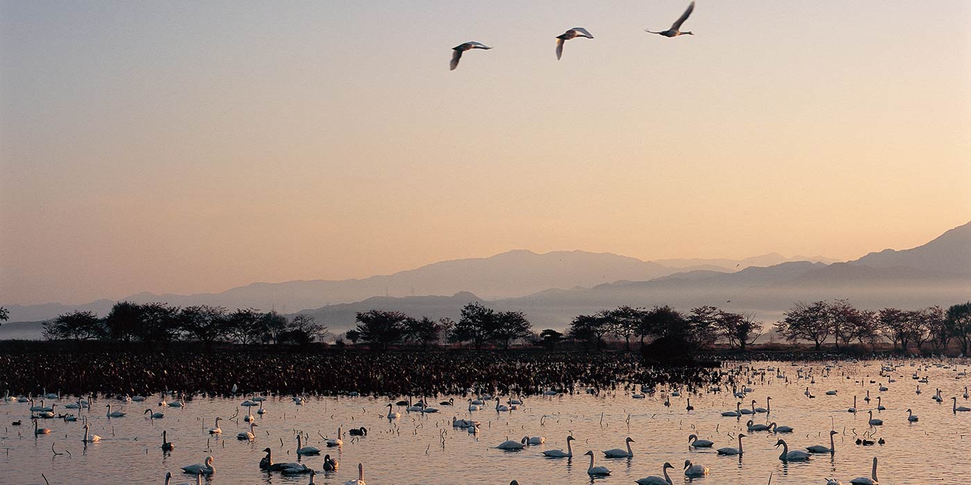 毎冬、たくさんの水鳥達が訪れる湖が、新潟にあります。冬の訪れを告げる白鳥やカモ達が舞い降りる湖の名前は、「瓢湖」。周囲わずか1.2kmほどの小さな人造湖で、およそ6,000羽もの白鳥が北から飛来し、冬を過ごします。白鳥の越冬地は世界中さまざまな場所にありますが、これほど小さな湖に多くの白鳥達が集まり、越冬するのは世界的にも大変珍しいことです。また、この湖は大自然の中ではなく、人々が住まう住宅地や耕地に面した場所にあります。大自然の中で暮らす野生の生き物を遠巻きに眺めるのではなく、人々の生活の営みの中で共に暮らしてきた野生の生き物を、この場所ではすぐ近くから見ることができます。白鳥達は冬の訪れと共に飛来し、春が訪れる前に再び旅立っていきます。北からの渡り鳥は、ここだけで見ることができる冬の新潟の美しさを教えてくれます。