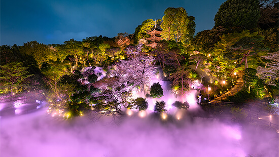 春の庭園演出 桜色に染まる『夜桜雲海』