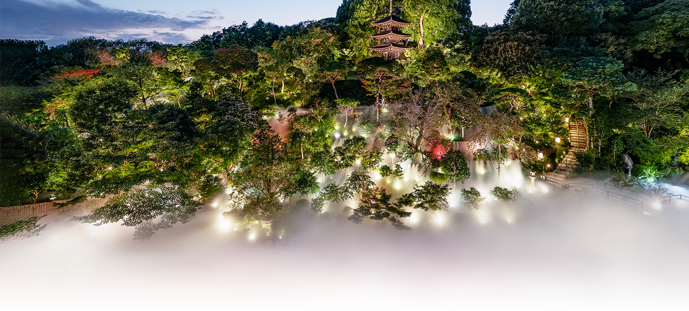 ホテル椿山荘東京の庭園の約3/4を覆う雲海は、人工的な霧ながら、