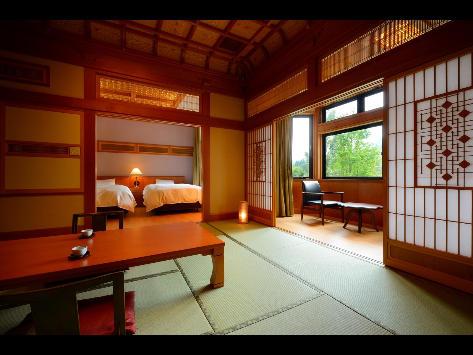 四季の彩りと木のぬくもりに包まれた、宮大工建築の湯宿。全館に格子模様の格天井や巧みな細工が施されており、ゆるやかな時間ご堪能いただけます。