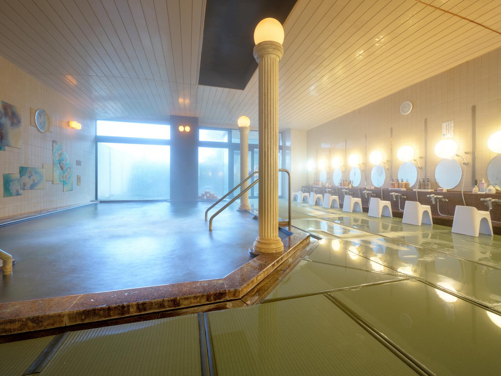 自家源泉のお湯は無色透明の優しい肌触りで赤ちゃんの温泉デビューにもおすすめです。また大浴場では柔らかな畳敷きでお子様やご年配のお客様に安心