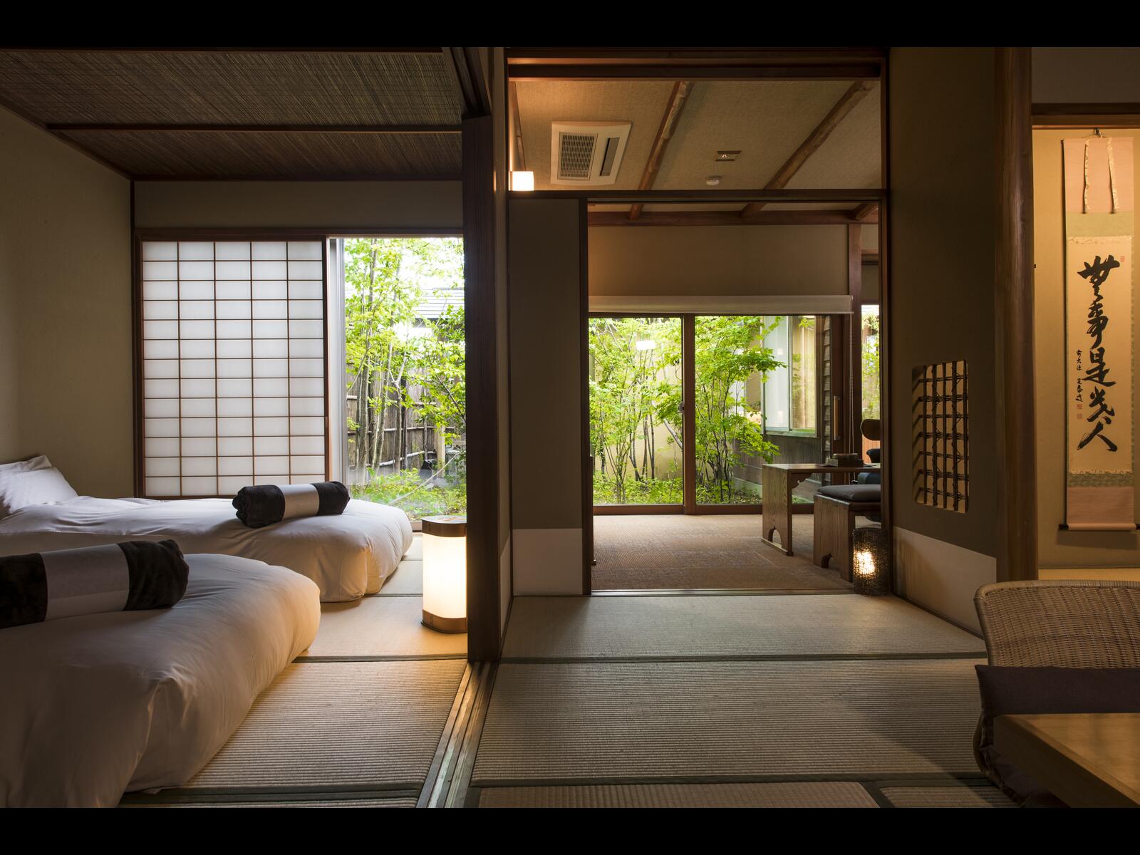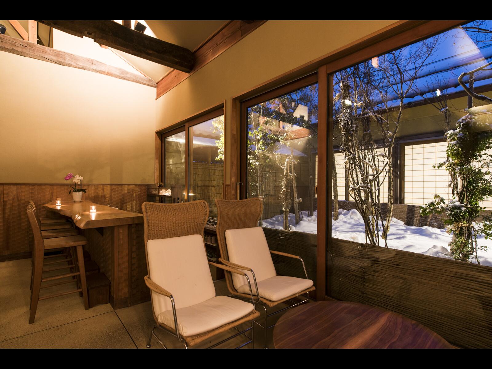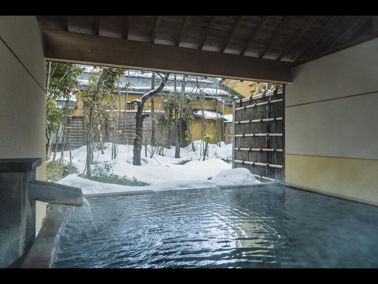 全室かけ流しの露天風呂付でございます。春いち早く咲く山茱萸。その花は春そのものであり、心待ちにする気持ちはお客様を迎える喜びに通じます。