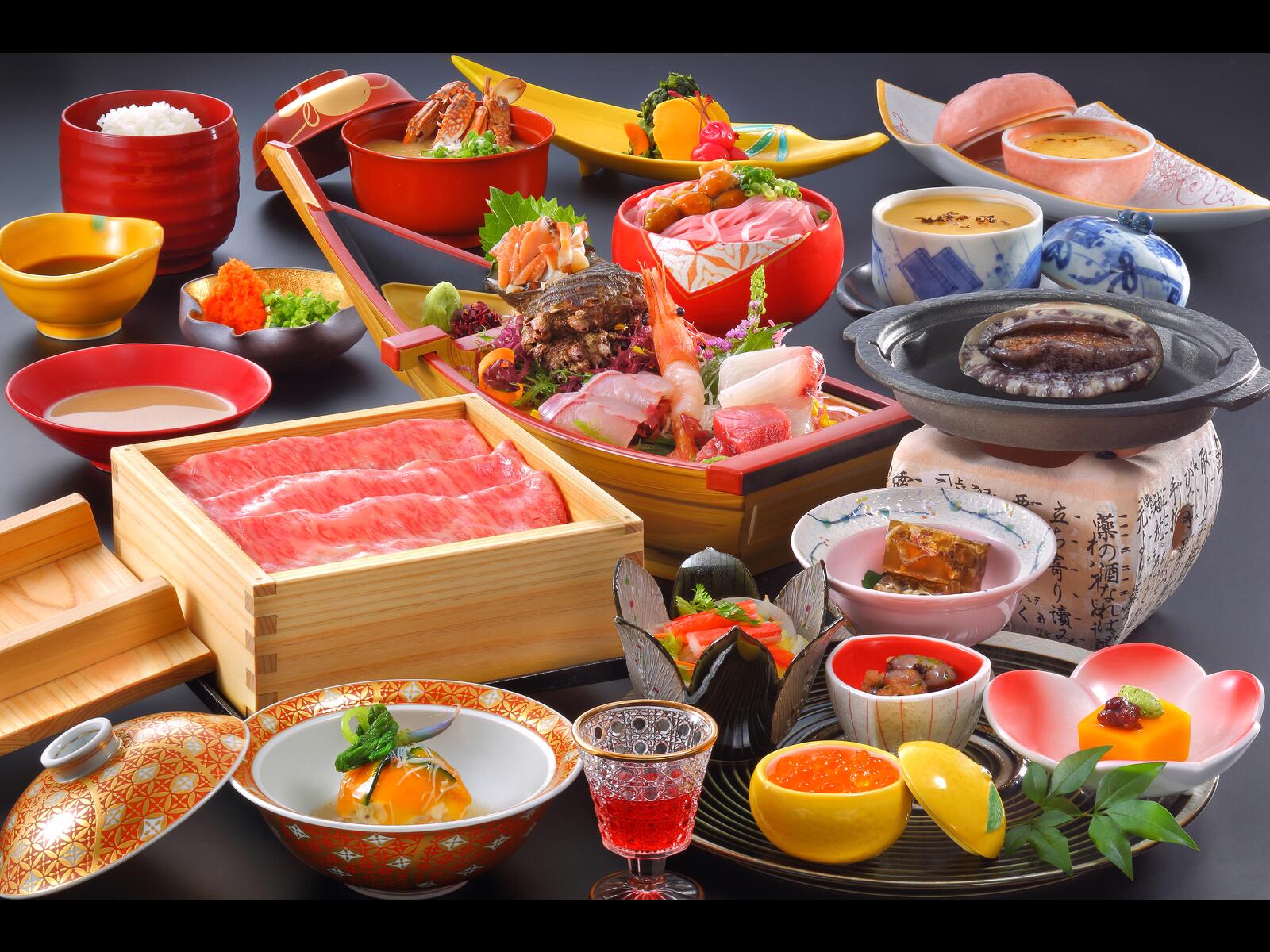 夕食は山形牛温泉蒸しとあわびの踊り焼き会席膳・庄内産の食材を贅沢に堪能!(特選料理)