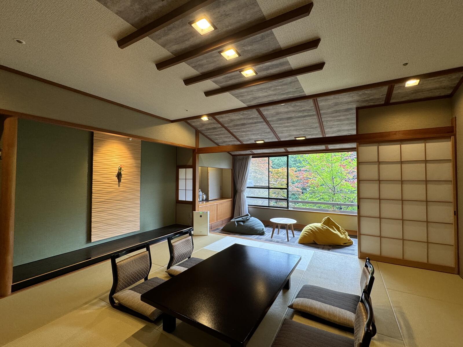 2023年2月にリニューアルした万葉館4階の露天風呂付客室。畳敷きの和室に和ベッドをご用意。