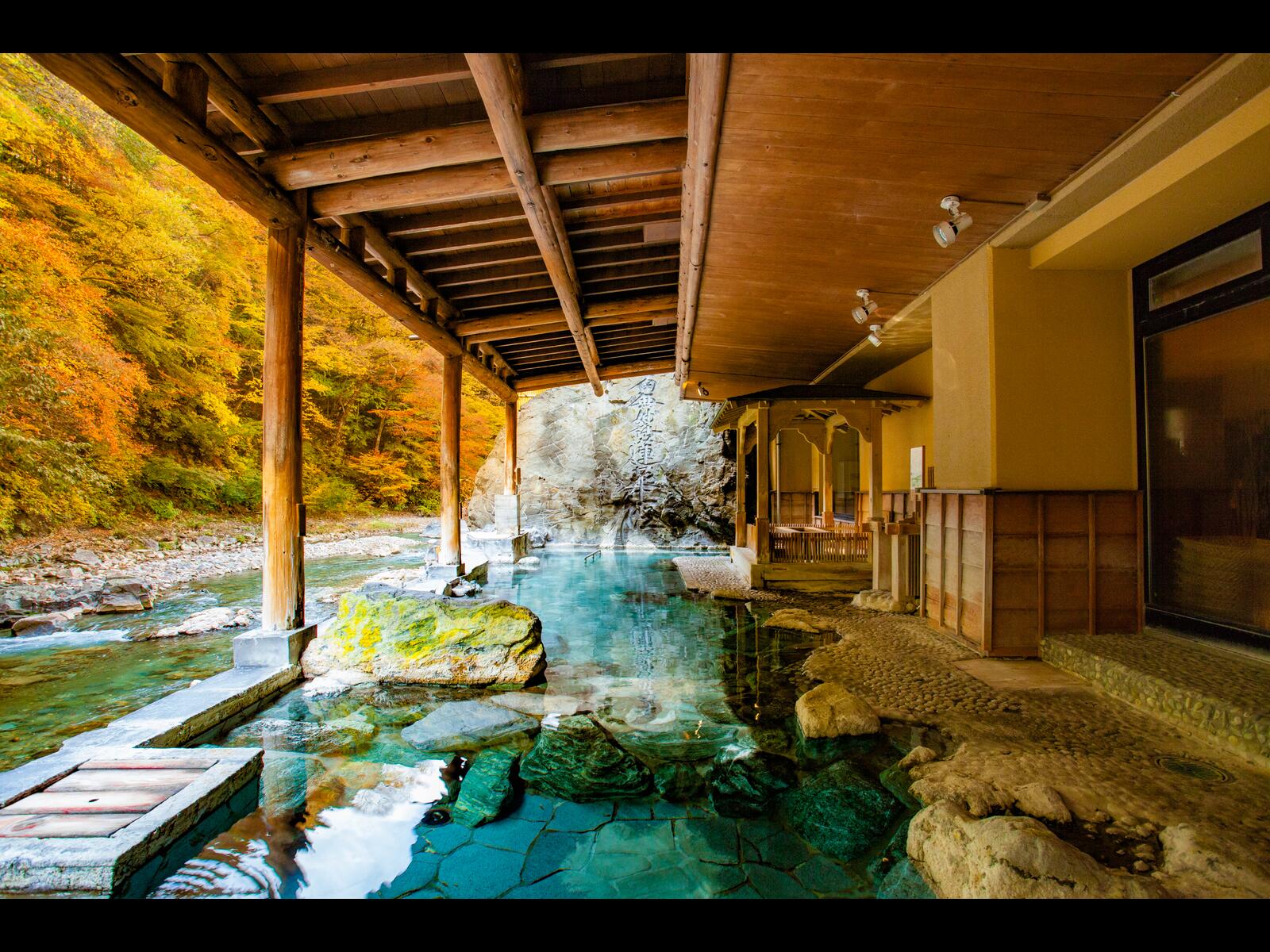 ■お題目露天風呂■四万川に面した、浴槽は長さ30mで開放感抜群。お題目を刻んだ大岩が目を引きます。