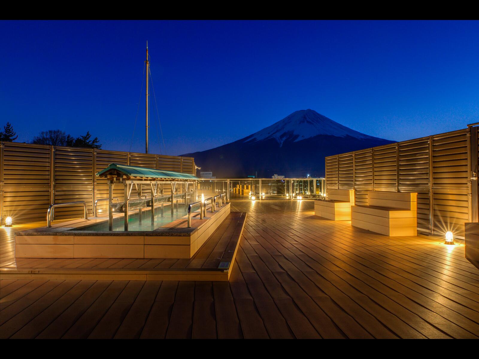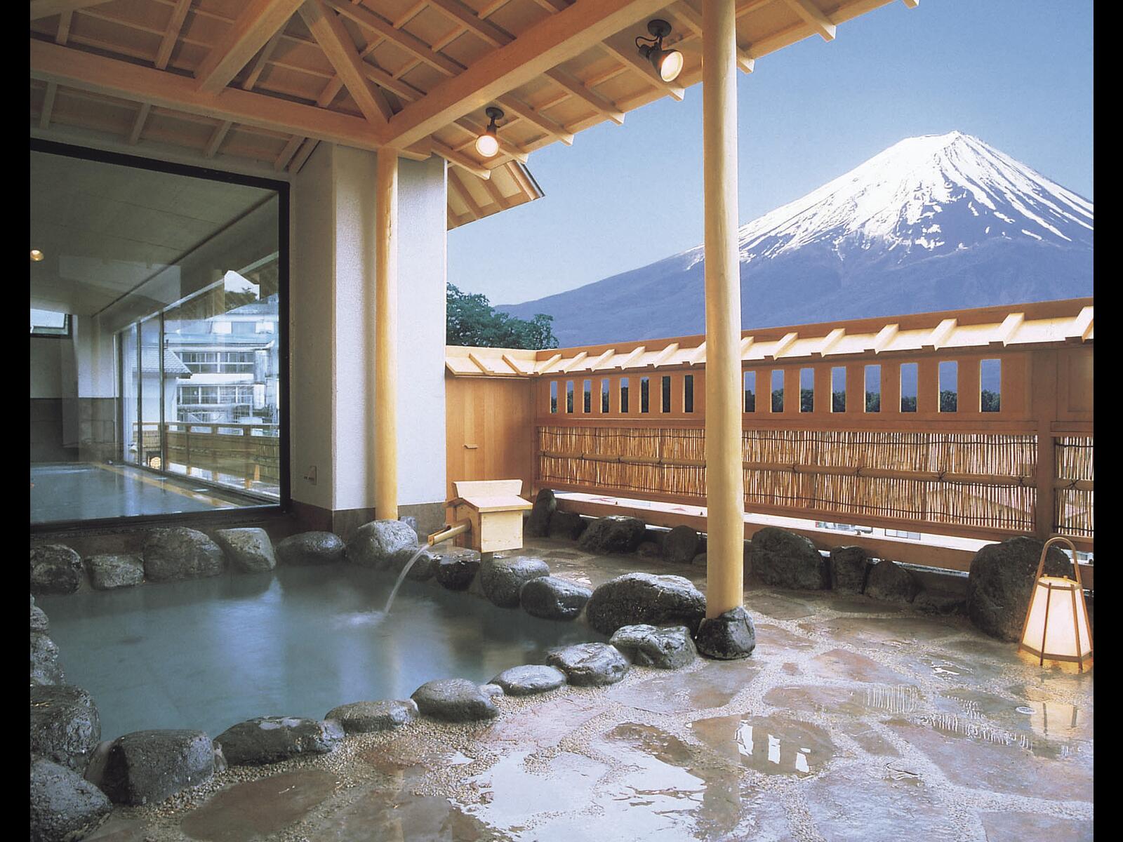 大浴場の露天風呂からは雄大な富士山を望みながらお寛ぎいただけます。夕食は和食会席、朝食はバラエティ豊かな和洋ブッフェをお楽しみください。