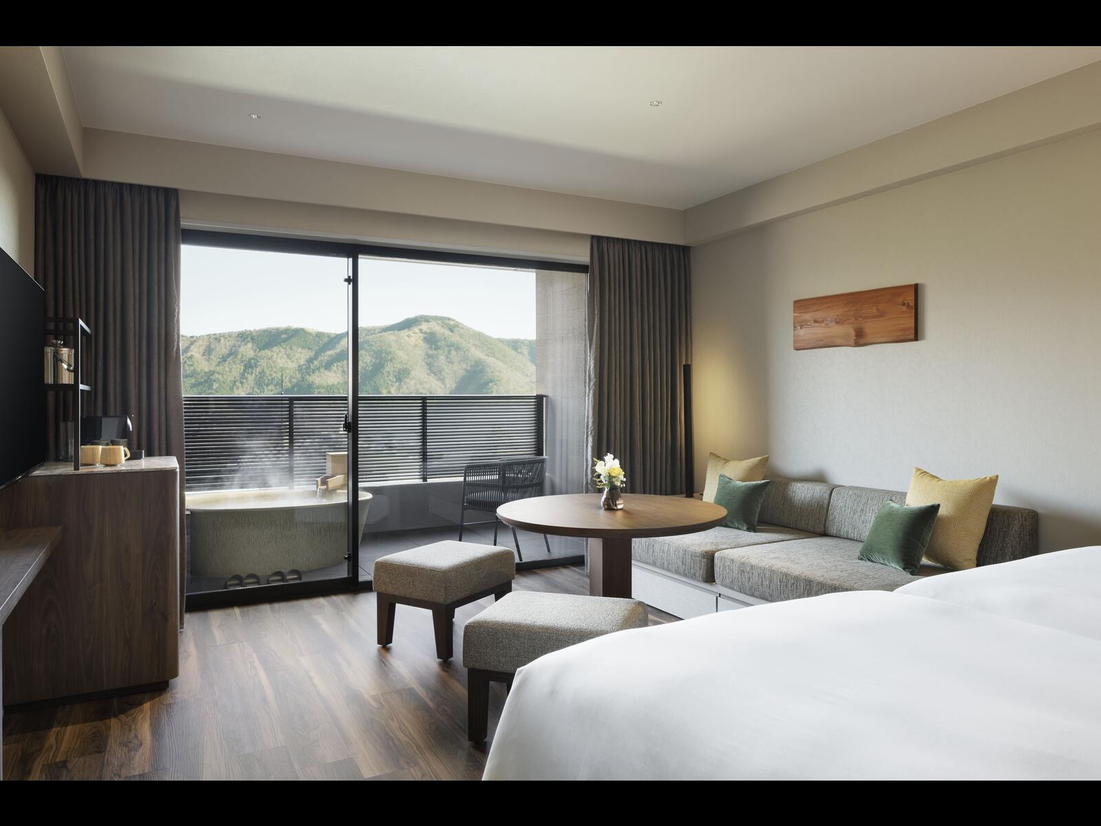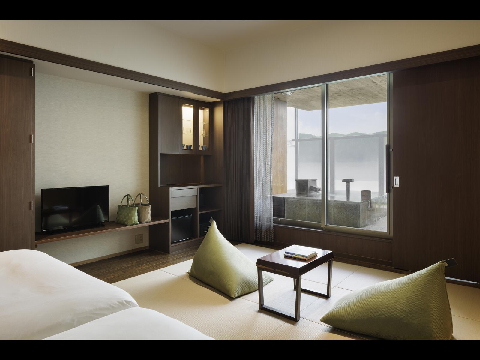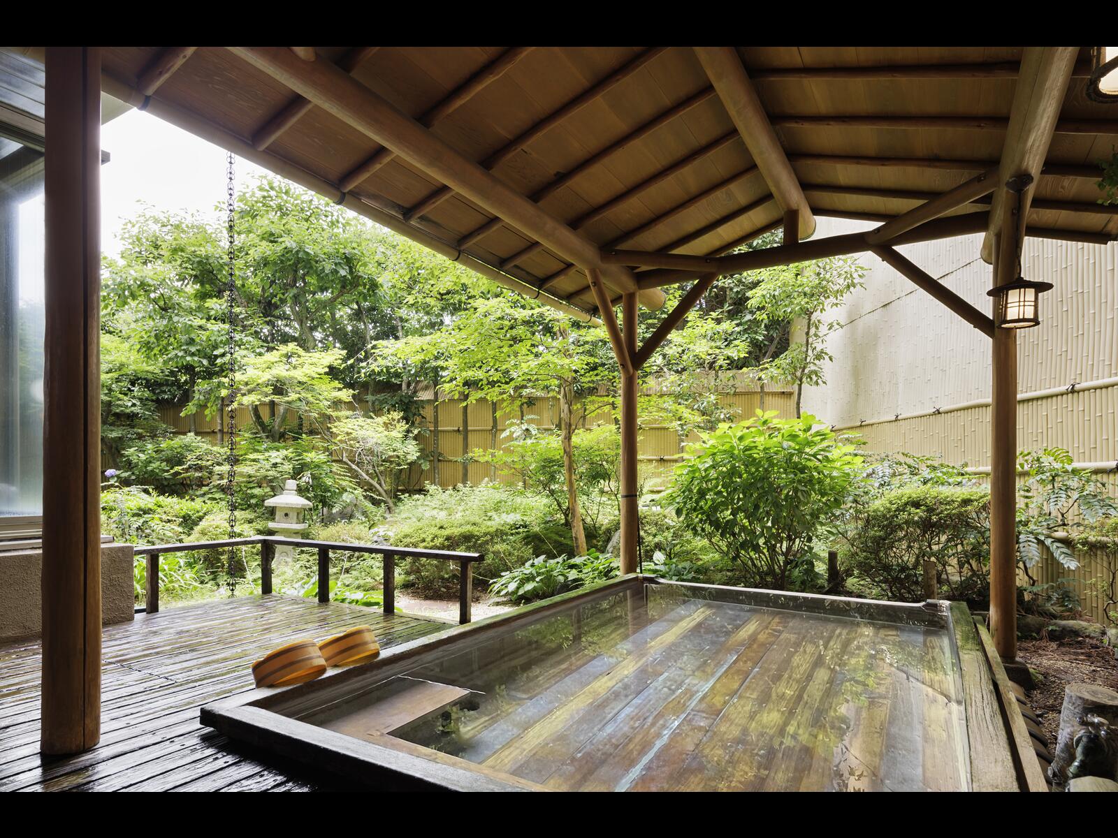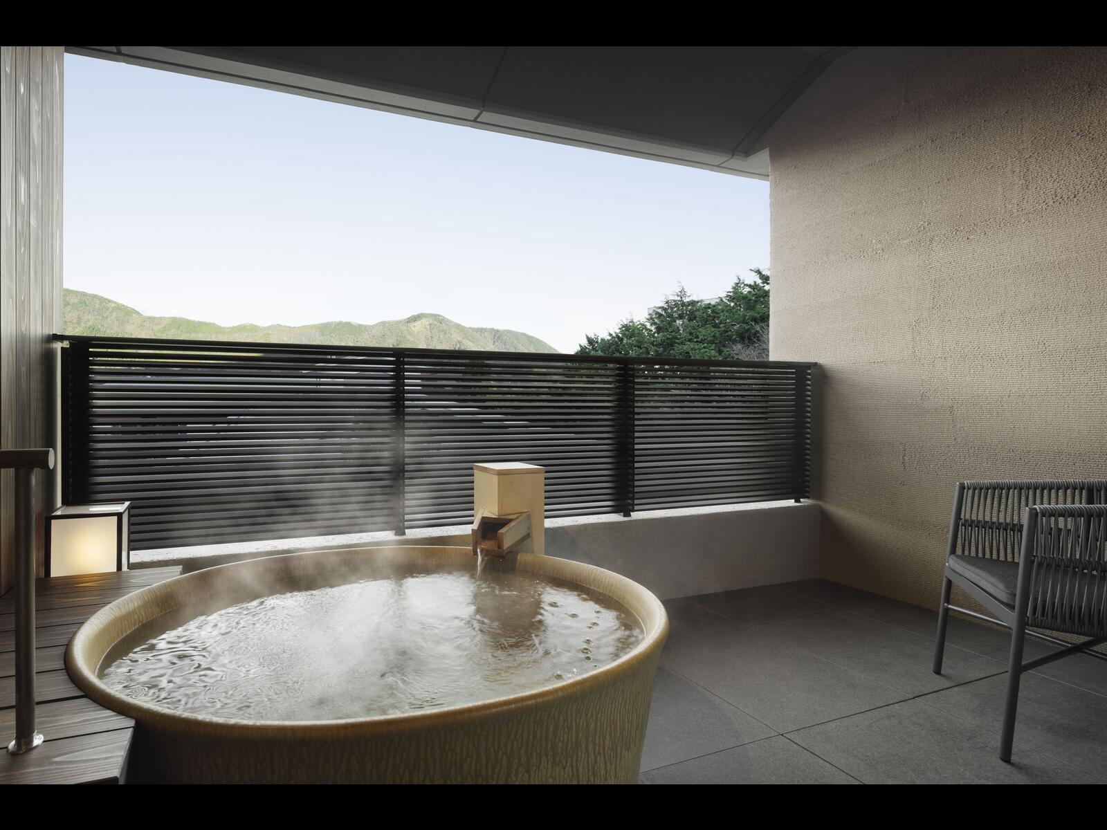 「五感で浸かり、豊かな時を織りなす」をコンセプトに温泉露天風呂とテラスを備え、箱根強羅の四季折々の美しい景色とともに良質ないで湯をご堪能いただける寛ぎの空間です。