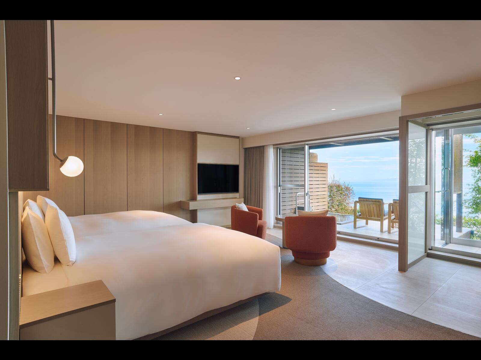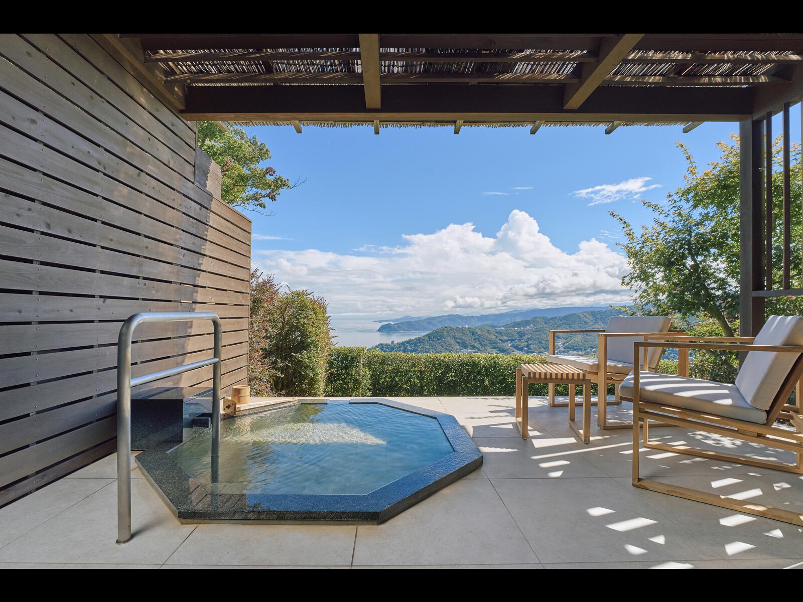 伊豆山361mに位置し、相模湾・熱海市内を一望できる、わずか16室の大人の贅沢空間。食事は伊豆食材を使った食のオーケストラをお楽しみください