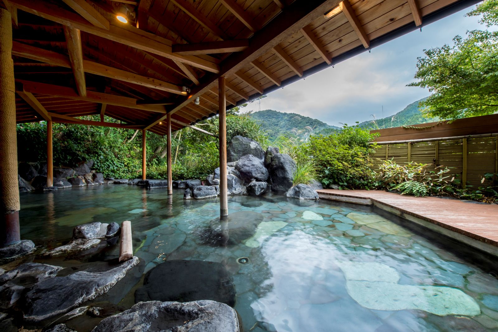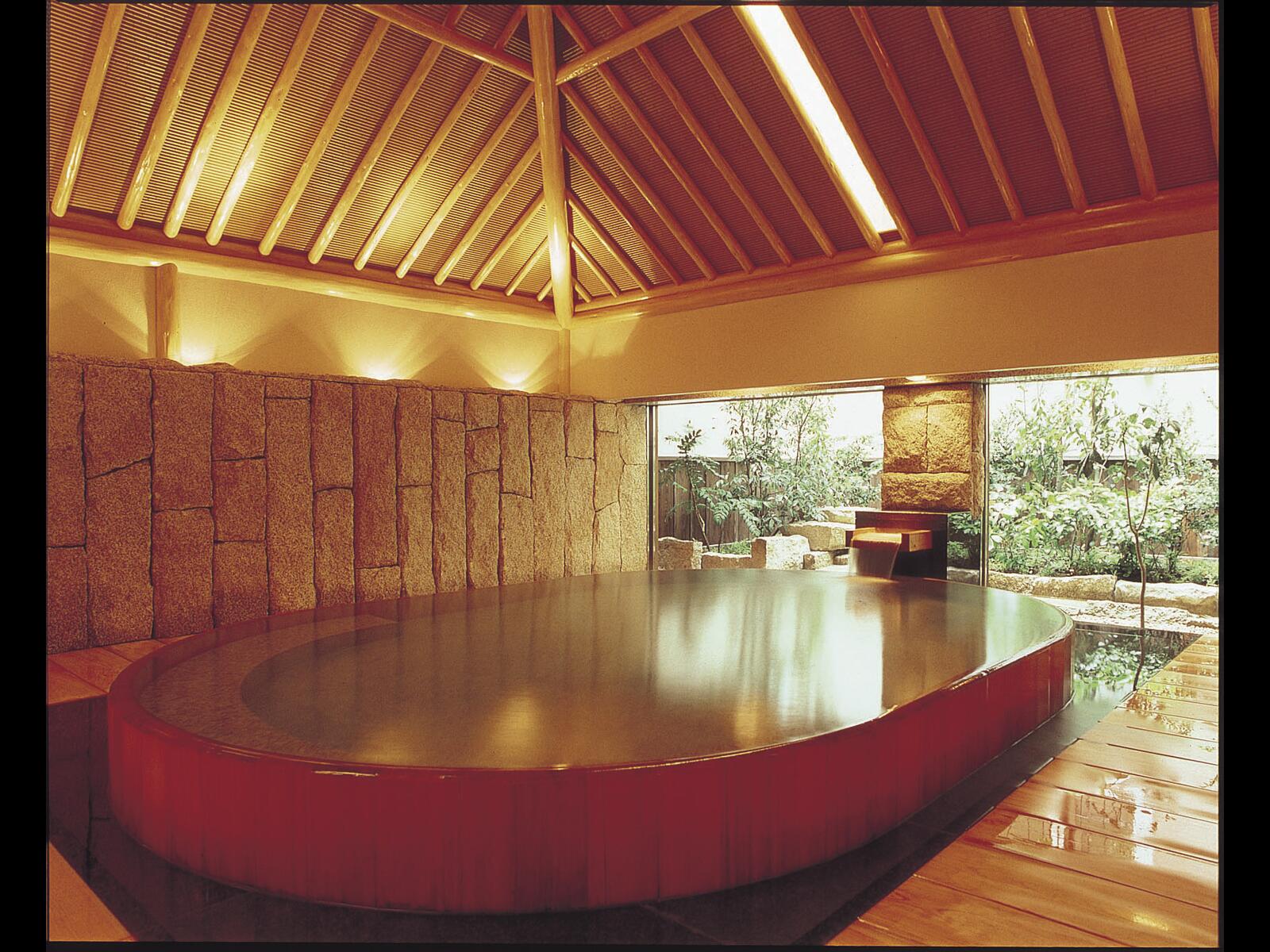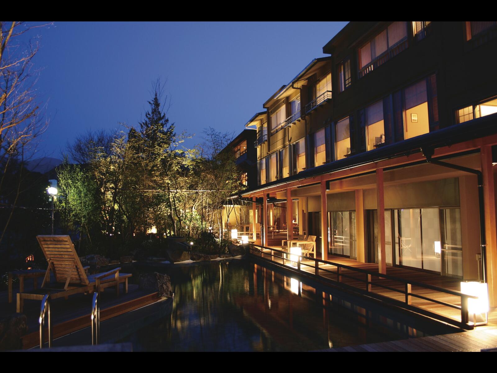自然に包まれた川べりに建ち、豊富な温泉に恵れ7の趣きの異る浴場は源泉掛け流し、お食事は個室ダイニングで出来たての旬菜会席料理をご用意します