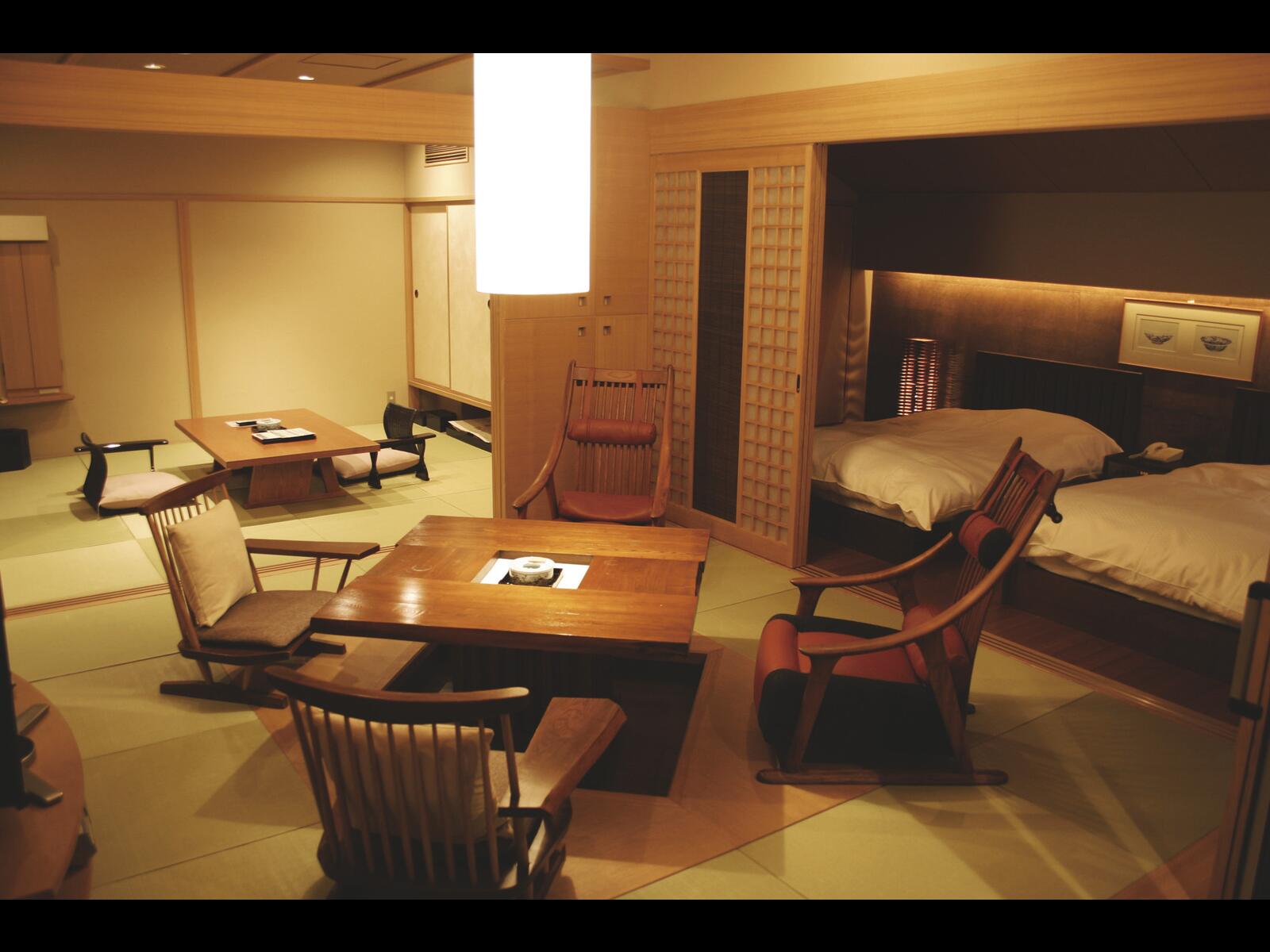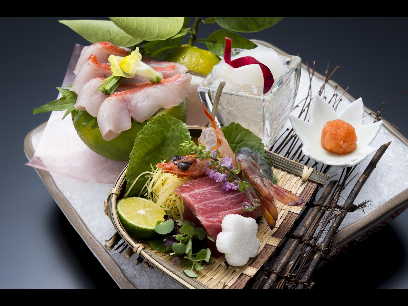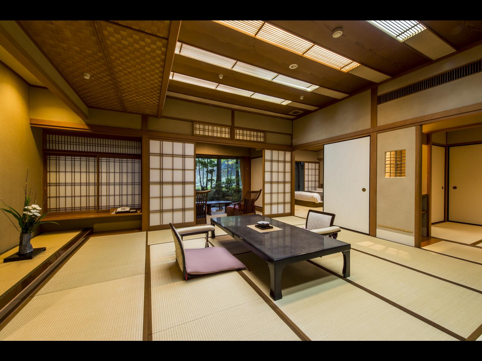 自然に包まれた川べりに建ち、豊富な温泉に恵れ7の趣きの異る浴場は源泉掛け流し、お食事は個室ダイニングで出来たての旬菜会席料理をご用意します