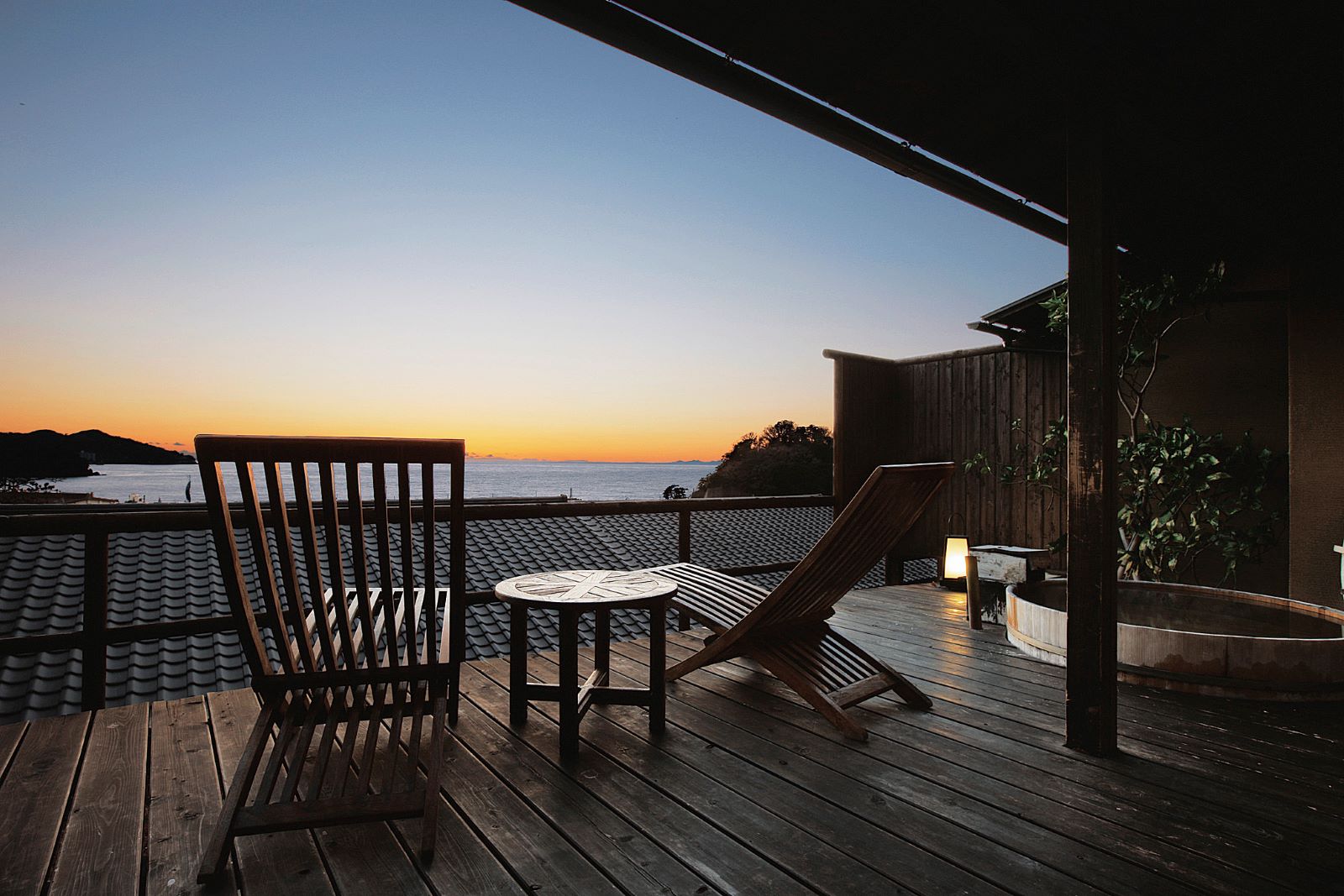 宿名ともなりました土肥温泉の名産枇杷の円き実、温かな色合い芳醇な香りを尊び温暖な海辺と黄金色の夕陽の光景に包まれる無雙のおもてなしをお届け。