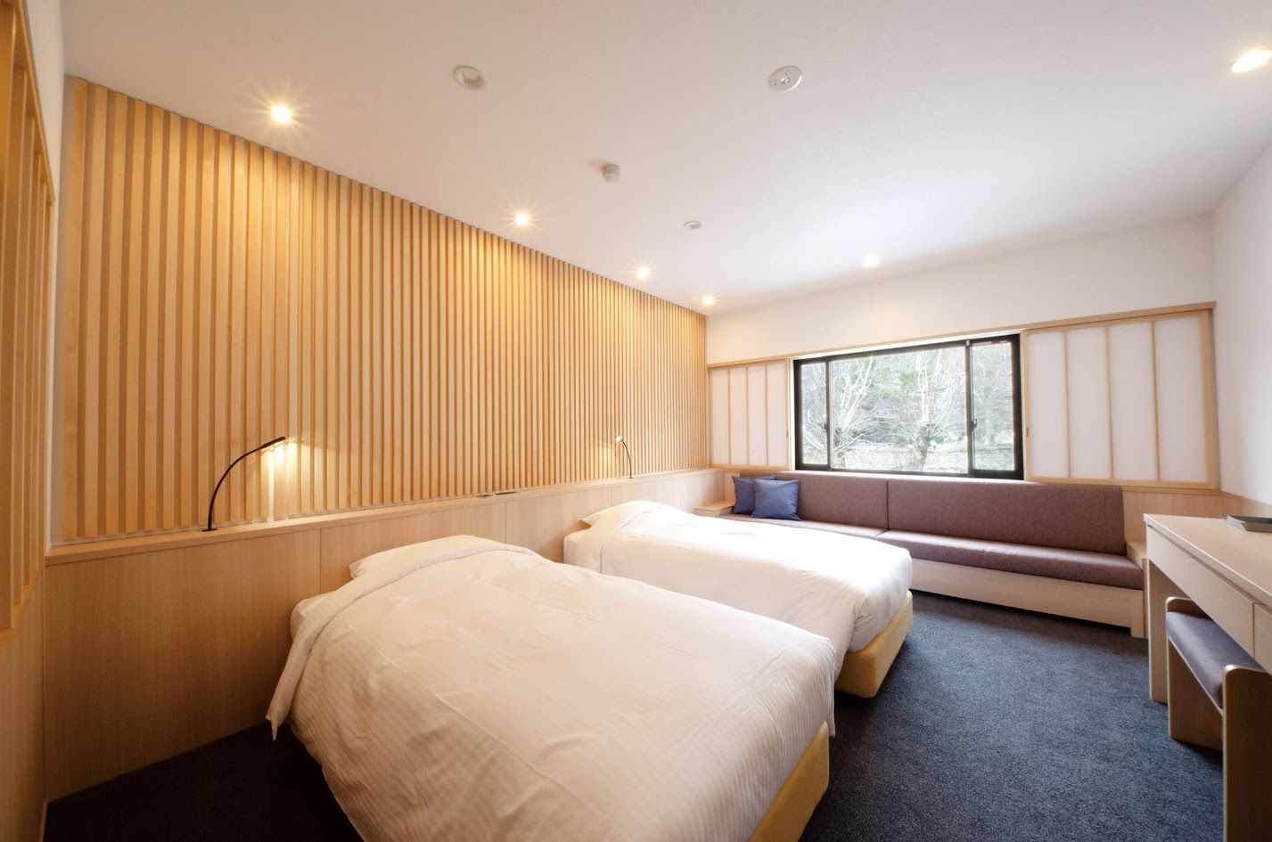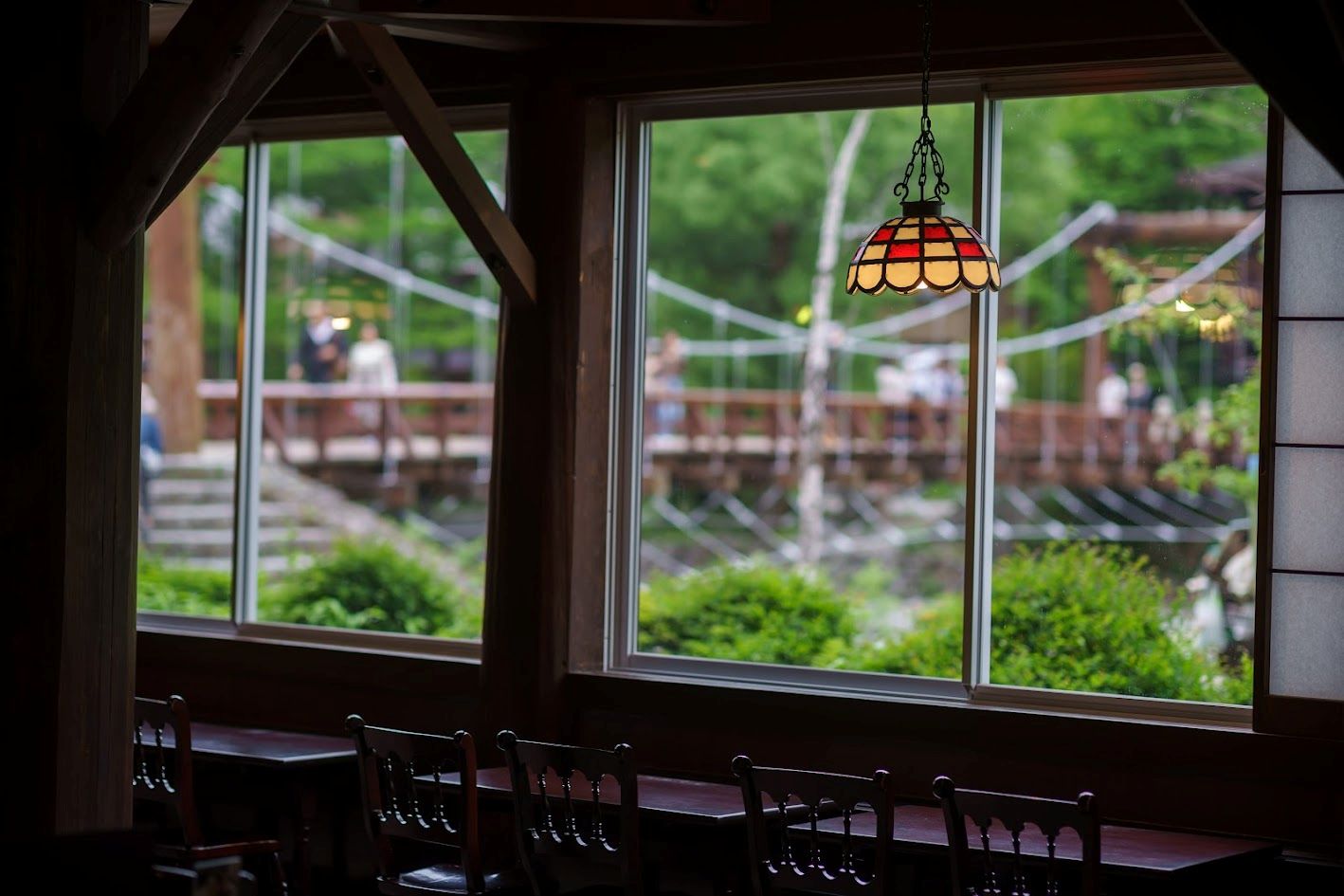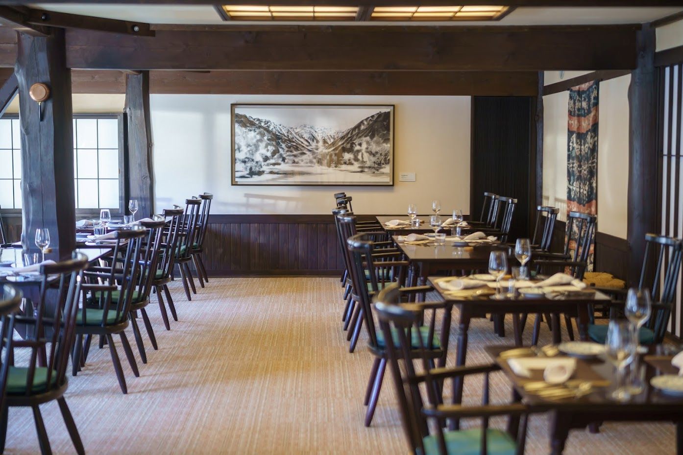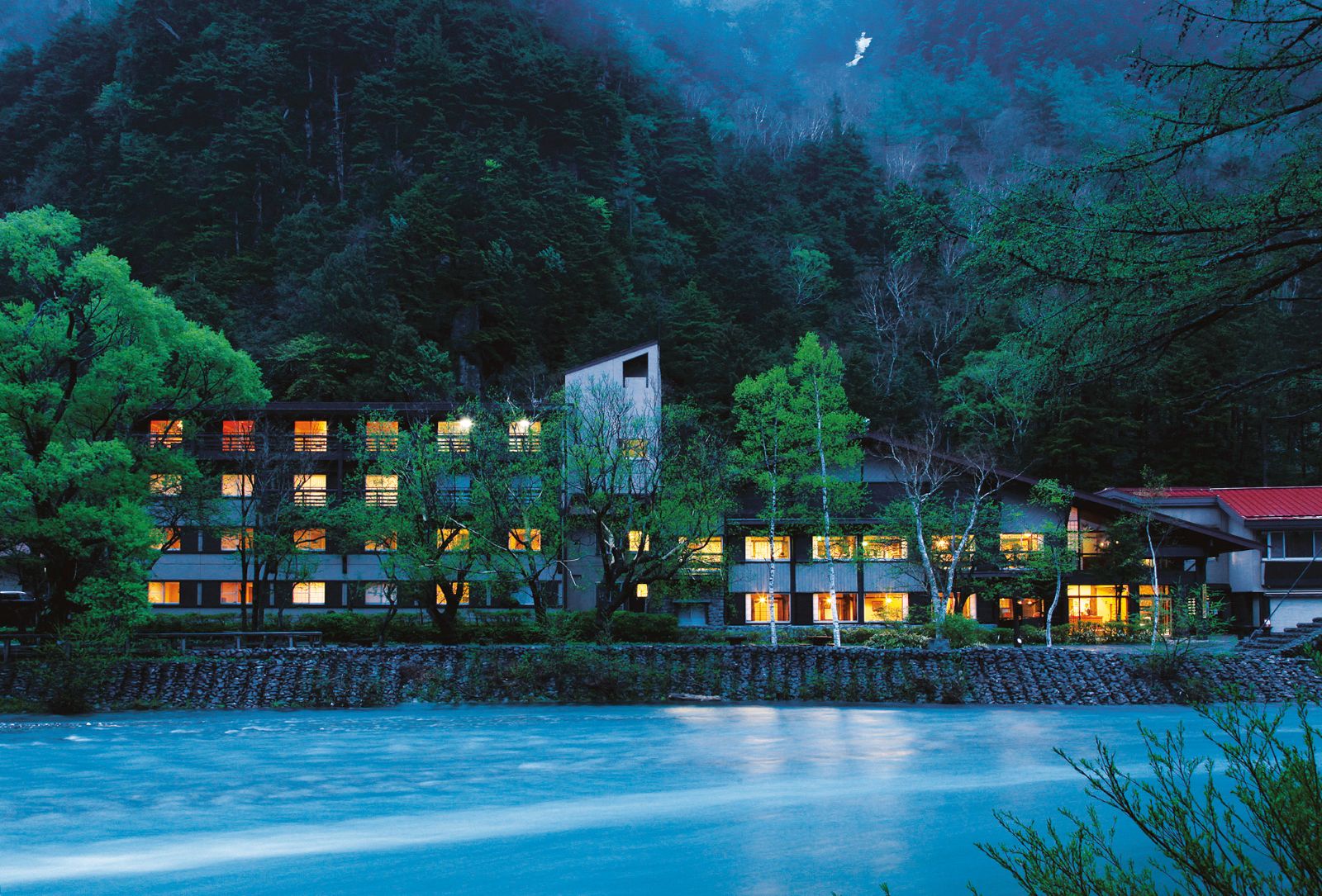 穂高岳の雄姿・清流梓川のビューポイント河童橋畔に建つ静寂と清潔な空間を提供する宿。四季の新鮮な地物素材にする独創的な仏蘭西料理は好評。
