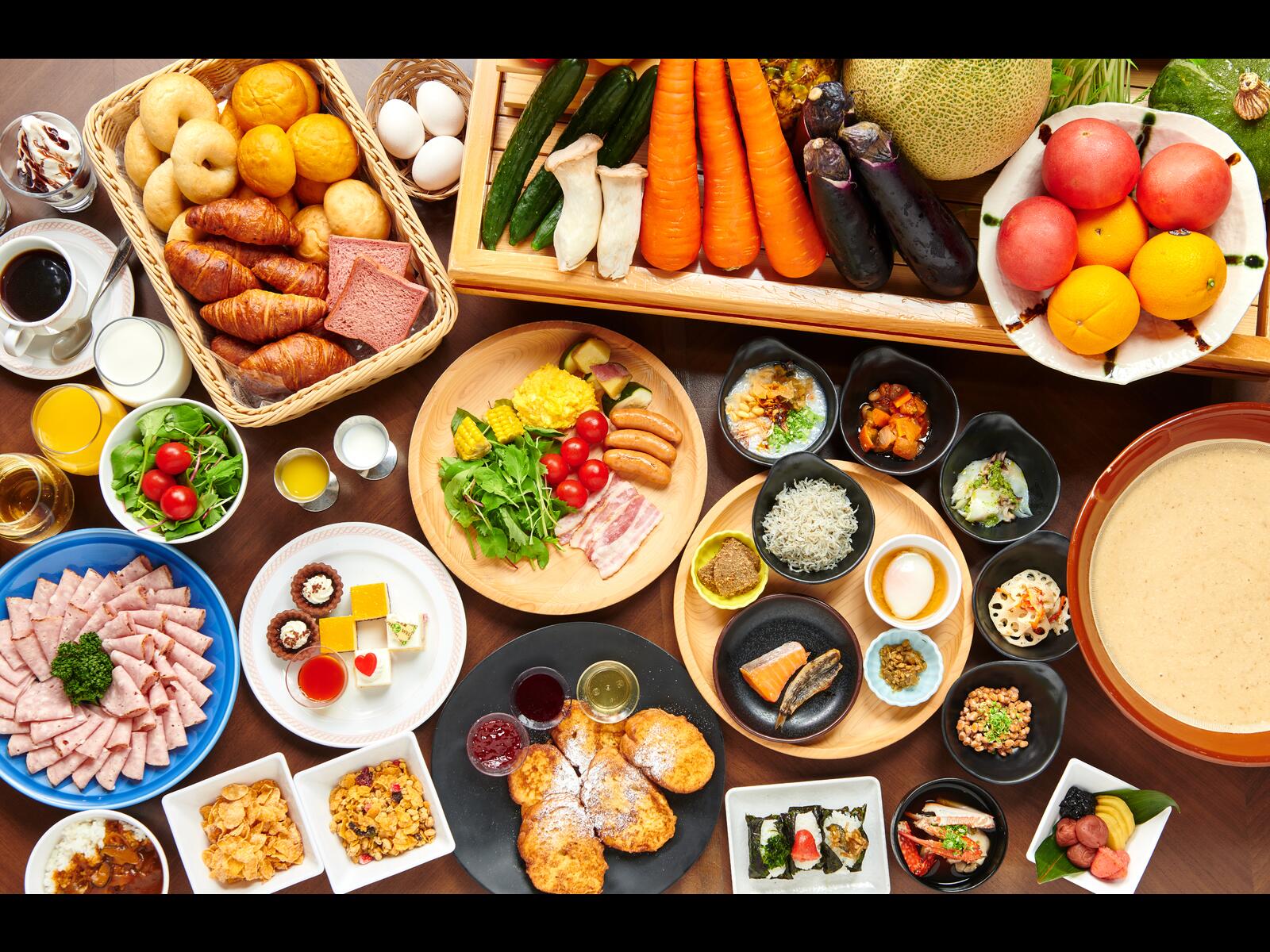 【夕食】出来立て料理や、地場産の野菜の健康志向料理等、美味しく体に優しいバイキング料理