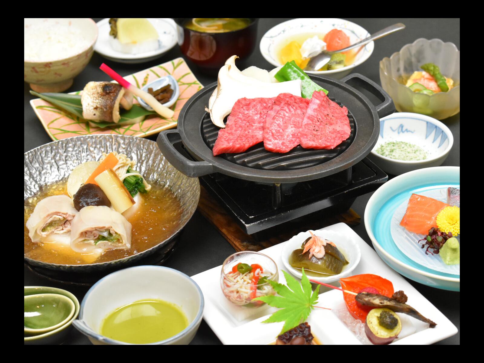 料理は四季と飛騨牛を使った和洋折衷会席をお部屋でゆっくり召しあがれます。(一部プランを除く)