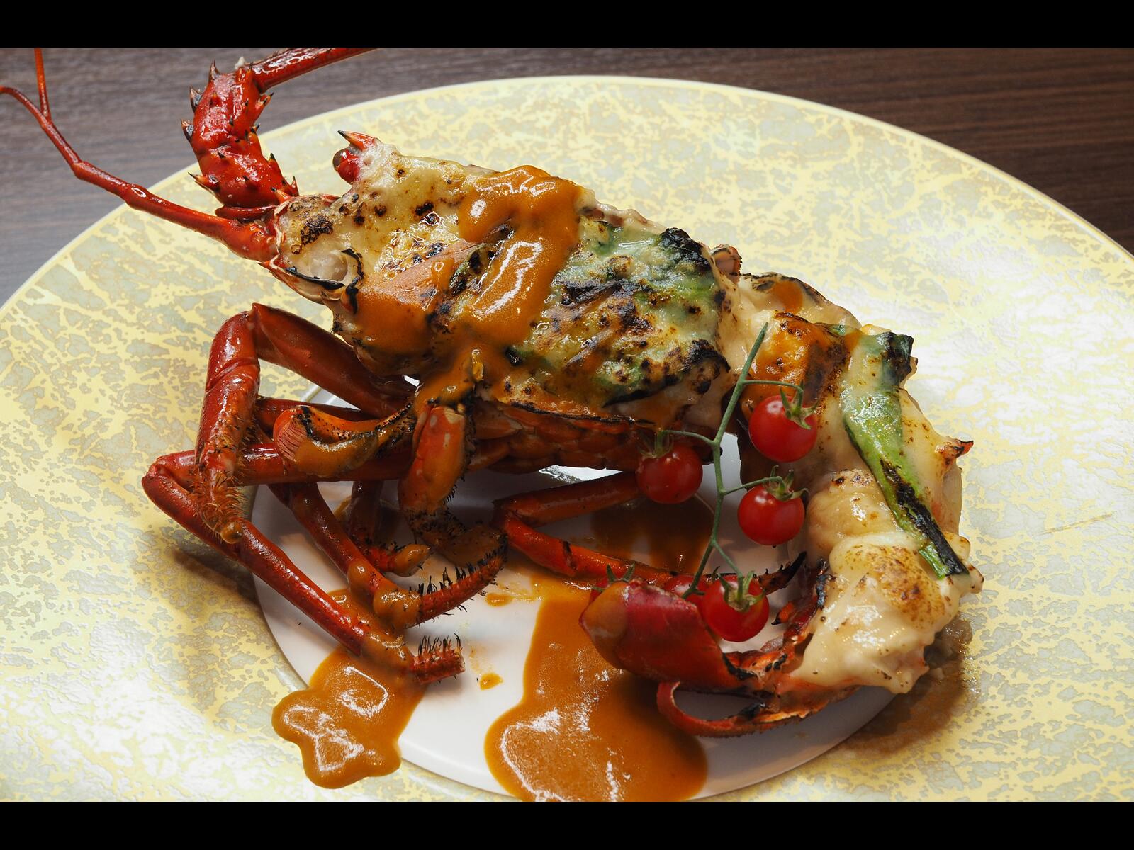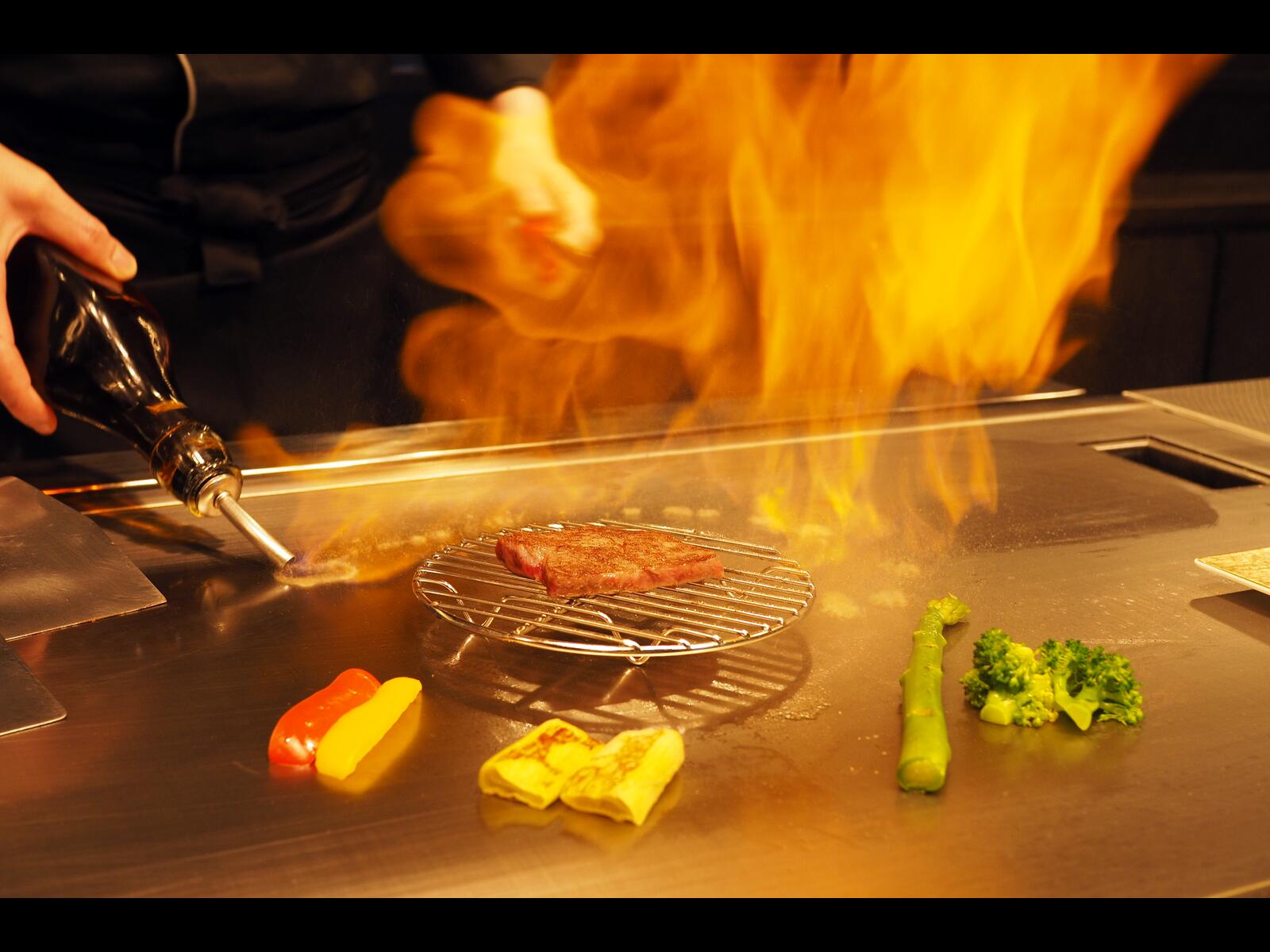 目の前で調理される伊勢海老やあわび、黒毛和牛の鉄板焼きは、